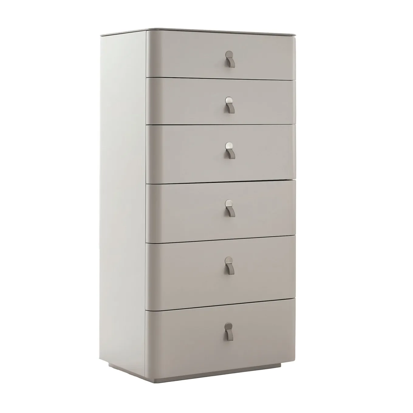 Progettato da Giuseppe Bavuso, questo comò vanta una struttura realizzata in rovere termotrattato o MDF laccato opaco, disponibile in vari colori. Il piano è elegantemente realizzato in pietra acrilica e ricoperto in pelle. I cassetti scorrono senza sforzo su guide metalliche, con frontali che si abbinano perfettamente alla struttura. Le maniglie in pelle con inserti metallici aggiungono un tocco di sofisticatezza. Questo pezzo presenta una finitura in MDF laccato opaco color crema con un piano in pelle abbinato.
