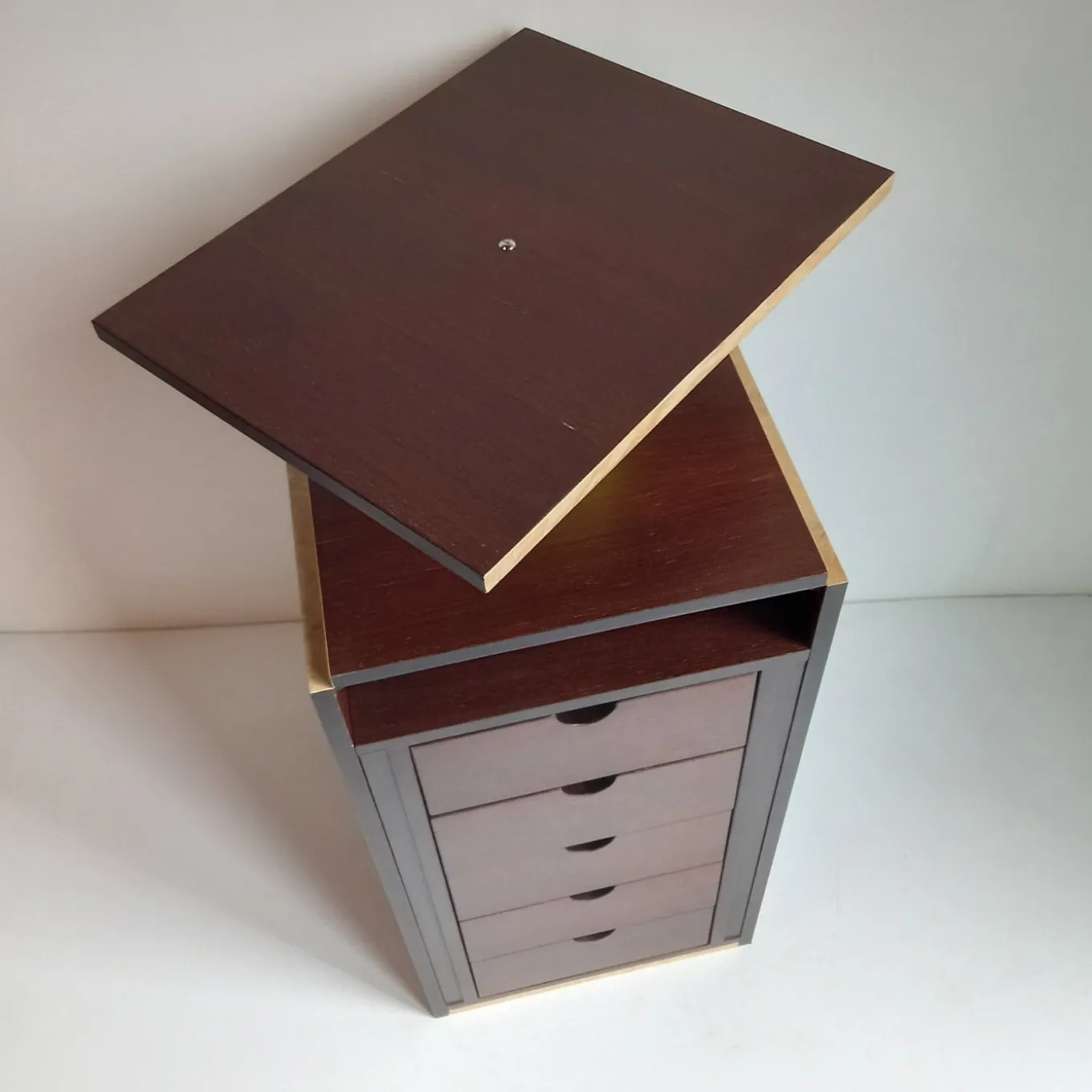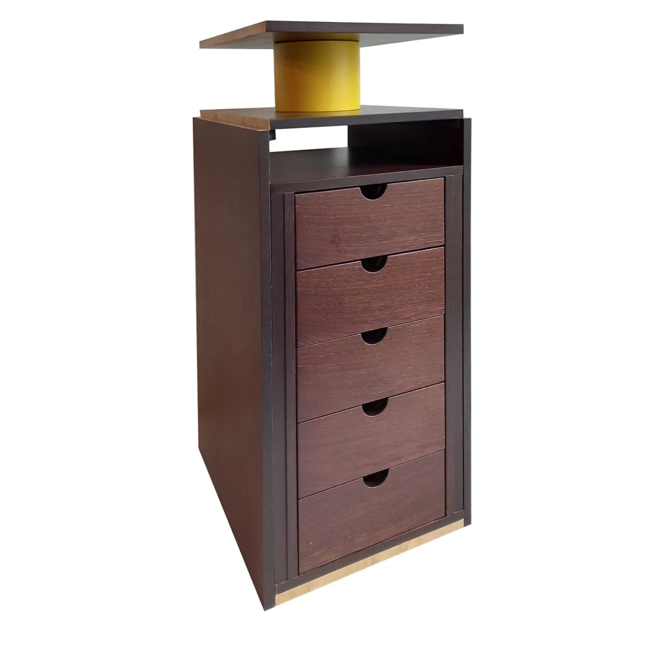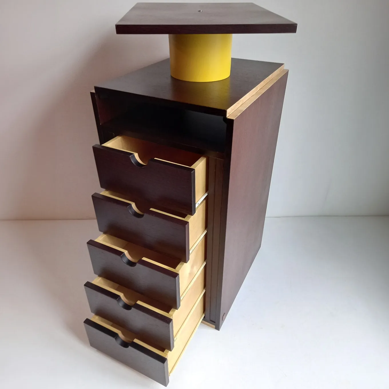 Parte di un’edizione limitata a soli dieci pezzi numerati e firmati, questa cassettiera è una celebrazione di volumi rigorosi e contrasti vibranti. La struttura cuneiforme vanta inserti in radica di frassino, i cui conflitti di finitura sono ulteriormente ravvivati dal cilindro in terracotta laccata gialla che sostiene un originale piano girevole.