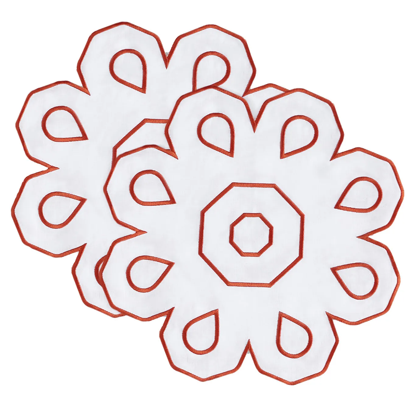 Questo raffinato set di due tovagliette utilizza un lino bianco di prima qualità (certificato Masters of Linen), che funge da tela per un seducente ricamo che evoca la pianta del Castello Svevo situato nella città pugliese di Andria. Ricamata minuziosamente a mano con il cotone Mako color corallo, ogni tovaglietta è un pezzo unico che si adatta a tavole sobrie o colorate con la stessa facilità. Parte di un’edizione limitata, il set è disponibile anche in versione da 6 pezzi; chiedete al Concierge il prezzo.