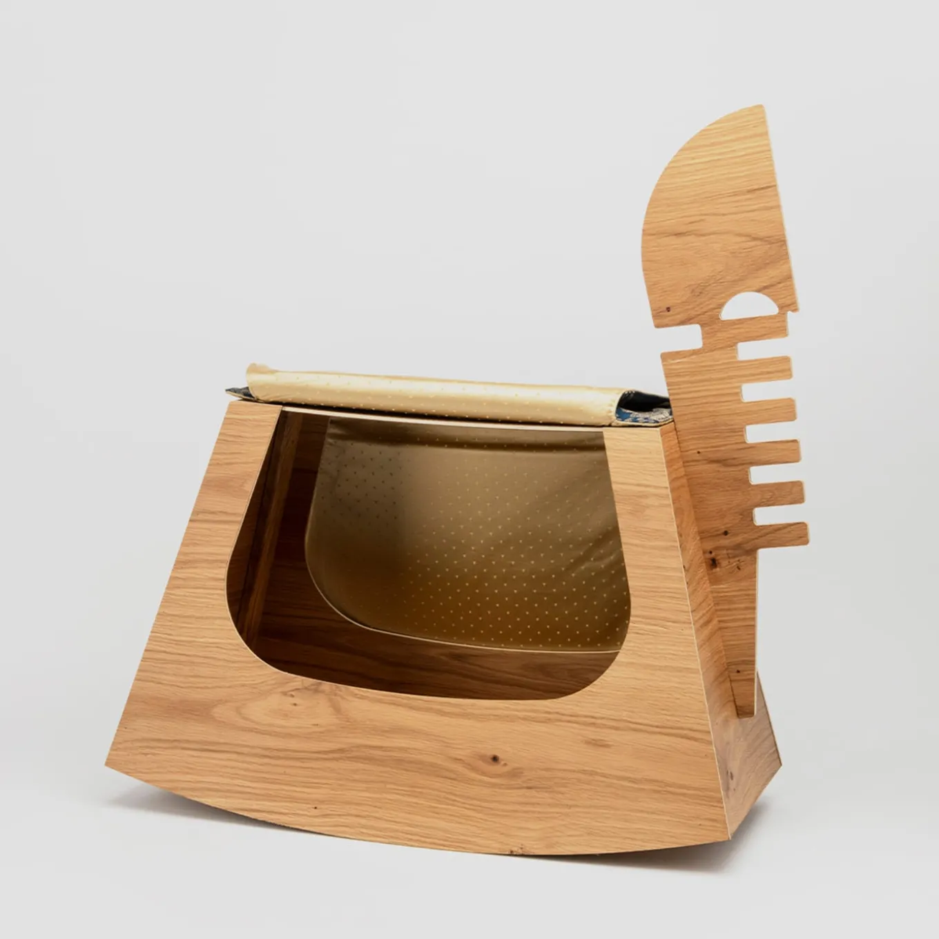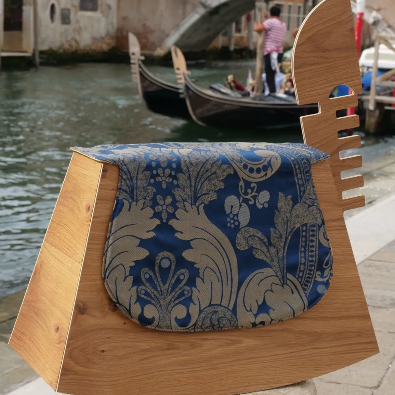 Un ibrido giocoso tra una gondola e un cavallo a dondolo stilizzato, questo design è un mobile contenitore che sintetizza abilmente funzionalità ed estrosità. Prendendo il nome dalle antiche scuderie dove un tempo i nobili veneziani conducevano i loro cavalli, può raccogliere libri o bottiglie o fungere da originale giaciglio per i compagni pelosi. Una raffinata sella in tessuto fantasia completa il pezzo, rafforzando la sua tenera ispirazione.