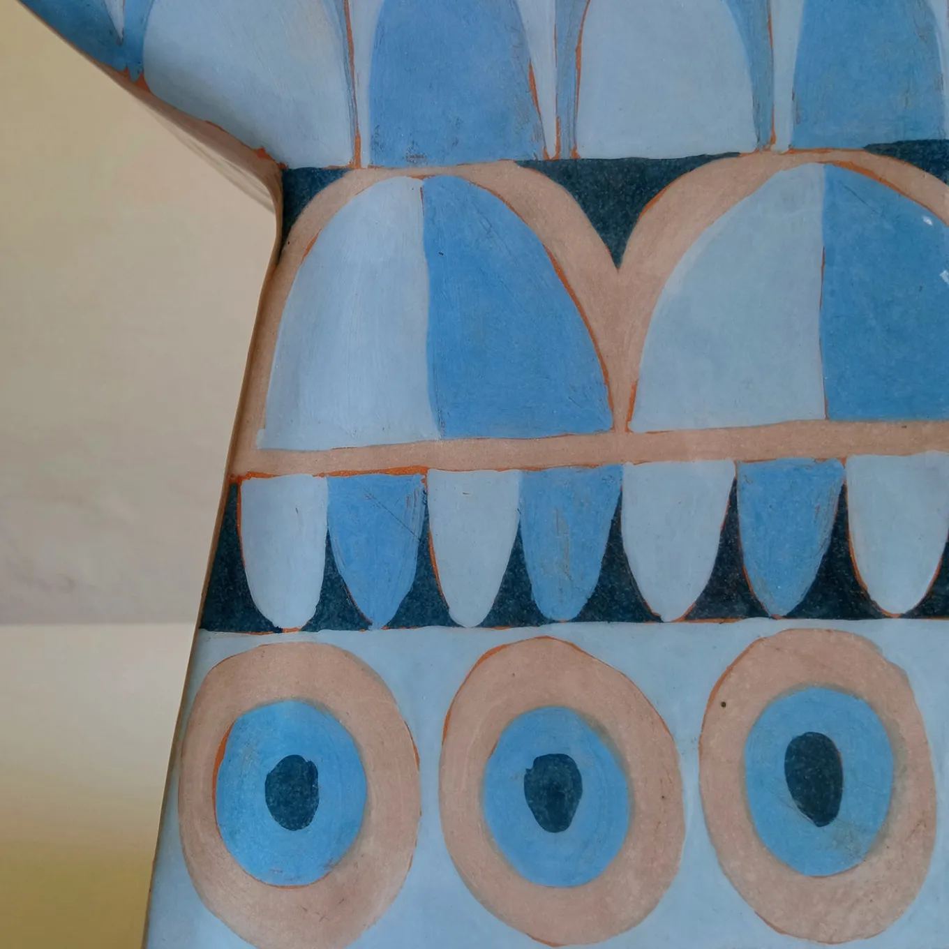 Questa alzata in terracotta presenta un design decorato a mano ispirato ai tradizionali motivi mediterranei. Mostra un’armonica combinazione di motivi geometrici in diverse sfumature di blu e toni terra, offrendo un’aggiunta accattivante a qualsiasi ambiente. La sua dimensione sostanziale e forma unica creano un impatto visivo audace, rendendola adatta sia a contenere frutta o oggetti decorativi che a migliorare l’atmosfera degli spazi interni. Ogni creazione è unica e può differire leggermente per via della lavorazione artigianale.