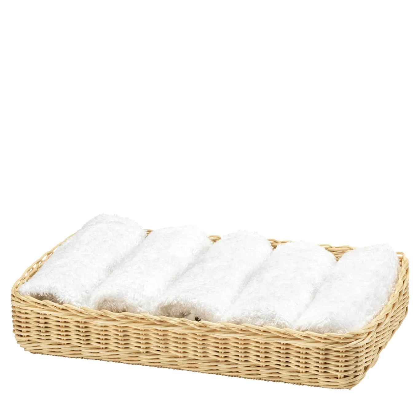 Raffinata aggiunta a contesti di ospitalità rustico-chic o a bagni privati come dettaglio di coccole per accogliere gli ospiti, questa cesta dalle linee pulite è stata meticolosamente intrecciata a mano da maestri artigiani per accogliere sei panni ordinatamente piegati in puro cotone. L’intricata trama che caratterizza i lati è sigillata da una treccia lungo il bordo superiore per una dichiarazione romantica e discreta. Sei strofinacci inclusi.