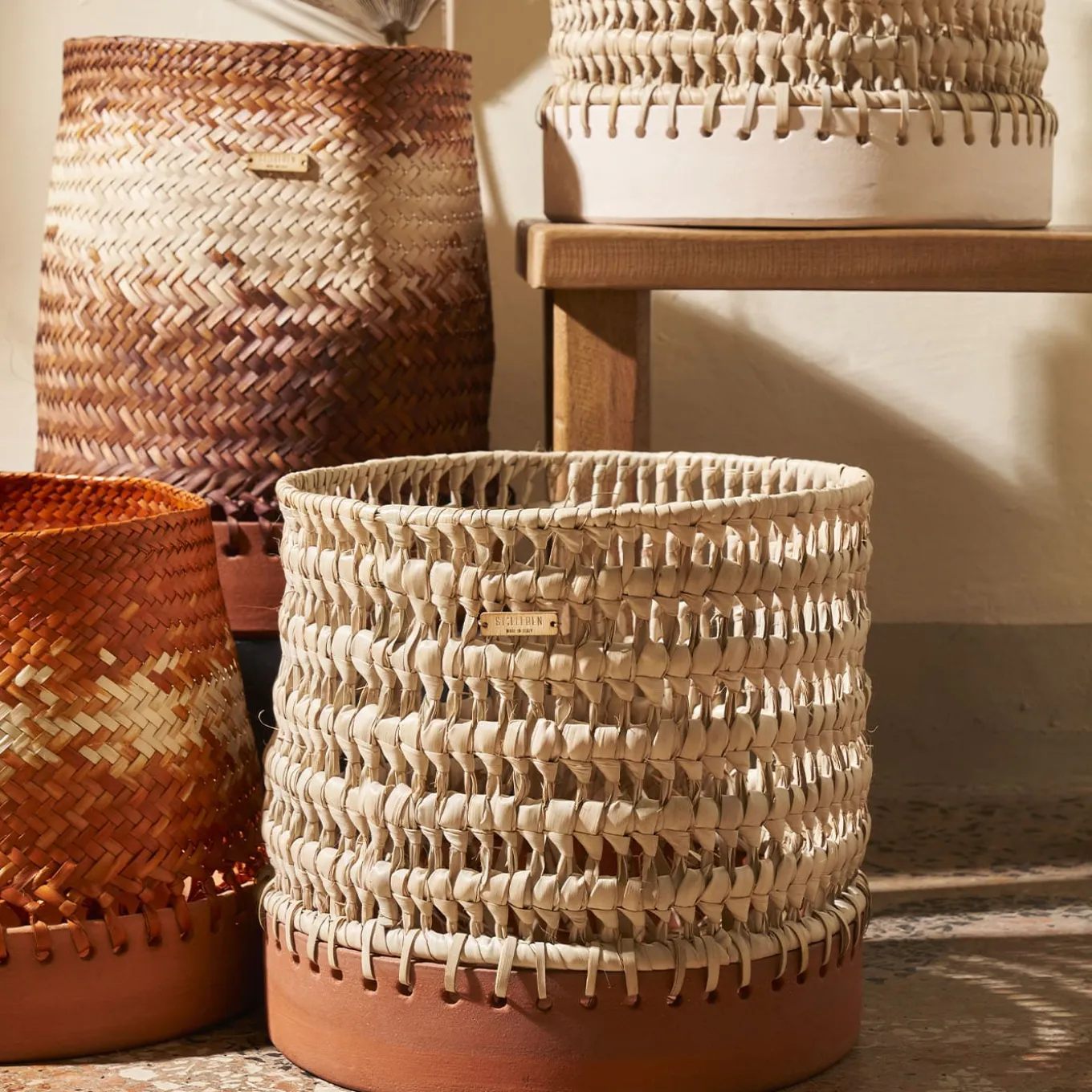 Realizzati a mano, i cesti intrecciati con foglie di palma si combinano elegantemente con le basi in argilla refrattaria, dando vita a un’armoniosa fusione di materiali. Questa sinergia ha prodotto dieci versioni uniche e vivaci, dando vita a cesti in ceramica che trascendono l’estetica per abbracciare la funzionalità. La miscela di materiali offre diversi utilizzi: perfetti come contenitori per piante, pezzi decorativi, organizer per il bagno, accattivanti centrotavola e versatili contenitori per vari oggetti. Ogni cestino è accompagnato da una scatola.