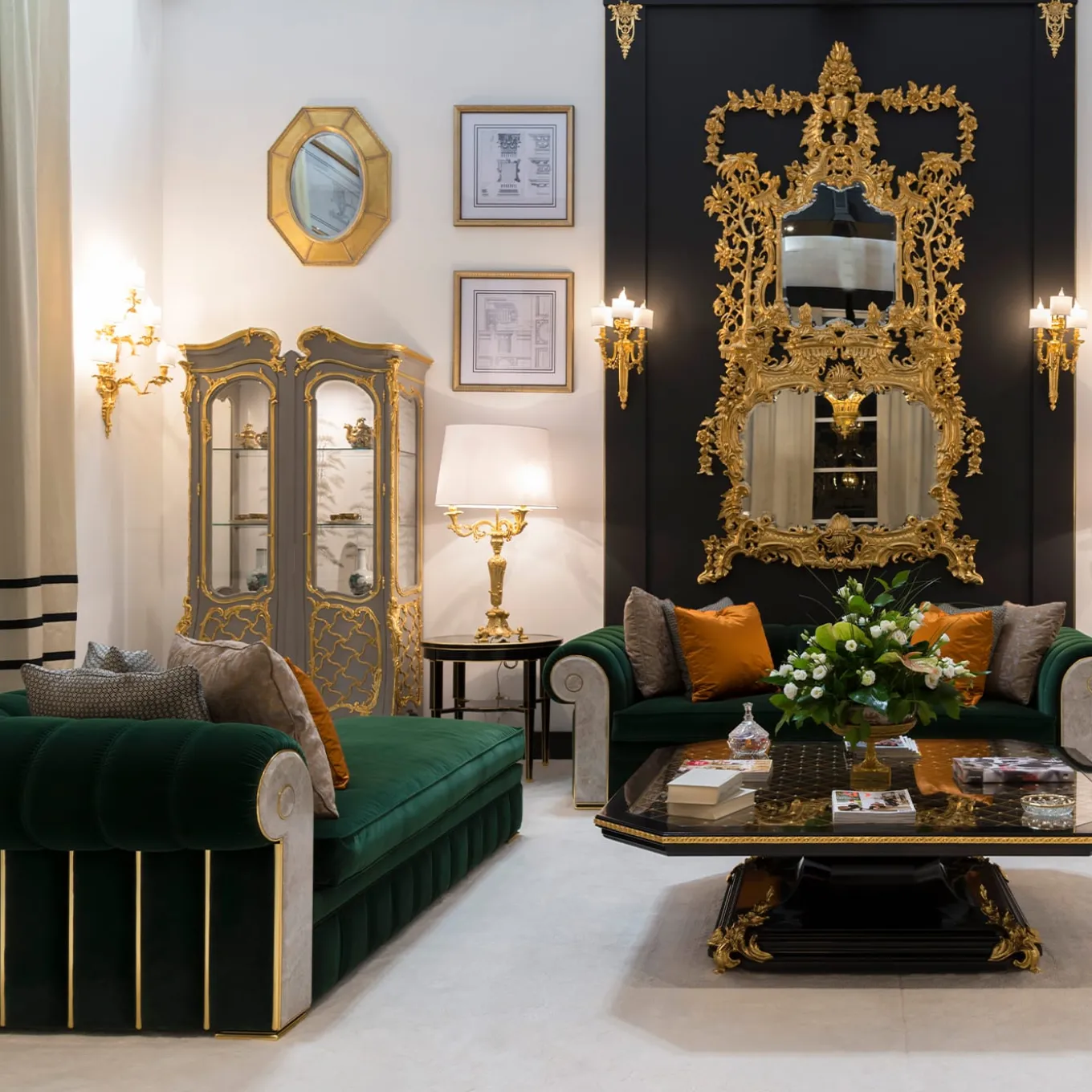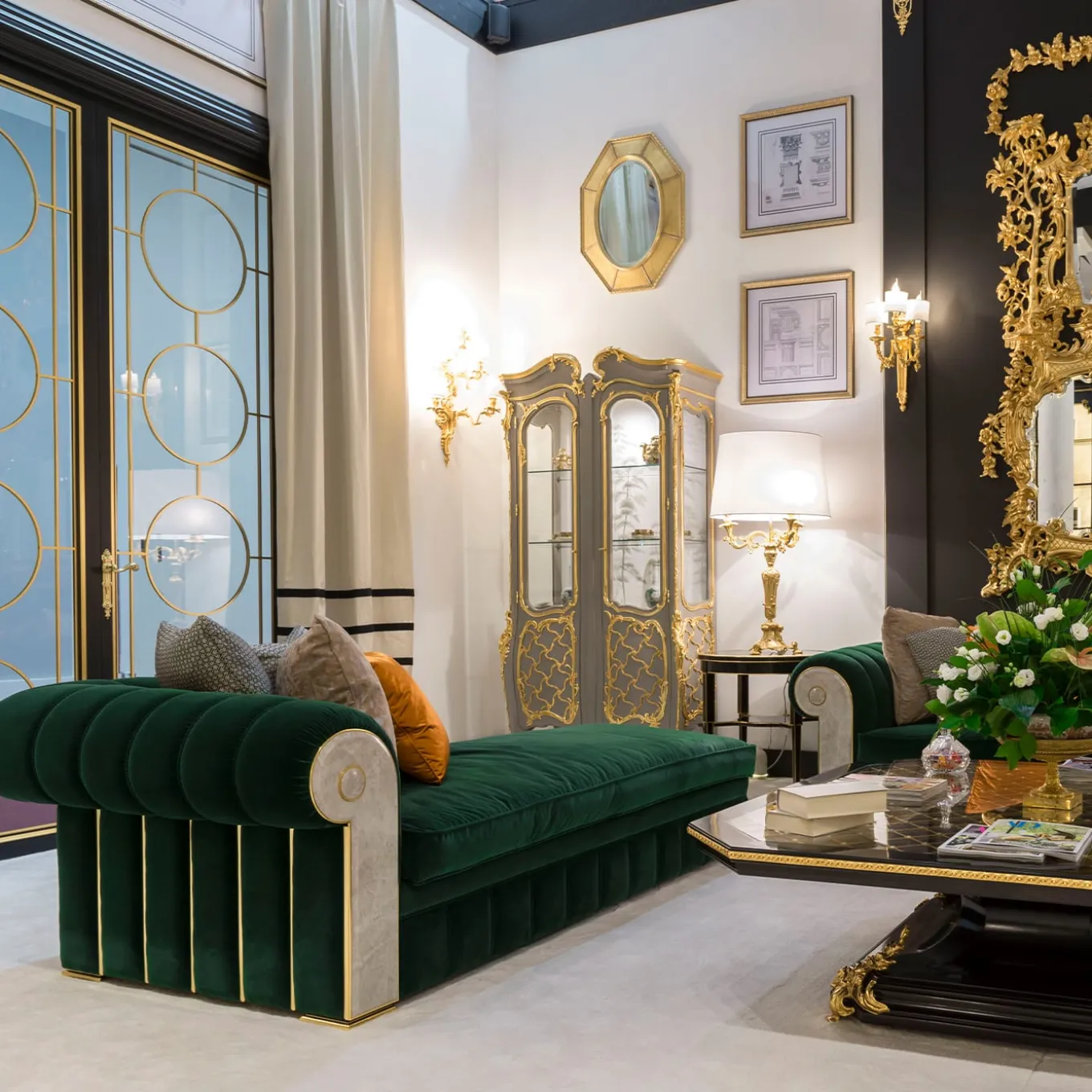 Lettino da giorno in stile classico, ideale per il riposo diurno in una stanza elegantemente arredata. Il velluto di cotone verde avvolge l’intera silhouette in legno, che è anche generosamente imbottita per garantire il massimo comfort. Lo schienale angolare presenta un profilo a spirale ed è deliziosamente accentuato da un design a canali delineato da strisce di ottone rivestite in oro 24 carati. Il lato anteriore del bracciolo è impreziosito da inserti in marmo Taj Mahal, che ne esaltano l’aspetto lussuoso. Contattare il Concierge per le opzioni di personalizzazione disponibili.