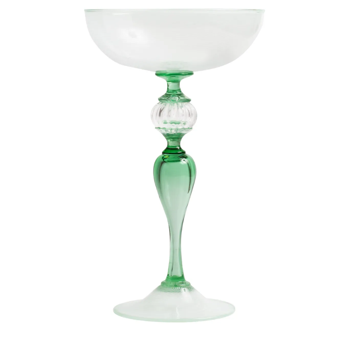 Una miriade di sottili linee parallele decorano il corpo e la base di questo squisito flute. Il gambo è di colore verde con una sfera centrale di colore cristallo.