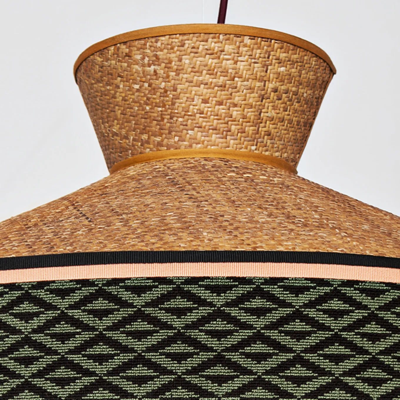 Questo lampadario fa parte di una serie limitata di 12 pezzi progettati tenendo presente lo stile eclettico dei ristoranti milanesi degli anni Cinquanta. In questo pezzo, una struttura in rattan si unisce a un tessuto decorato con motivi geometrici, per creare una forma che ricorda le case con il tetto di paglia, ricordando anche la forma delle lanterne utilizzate nei giardini.