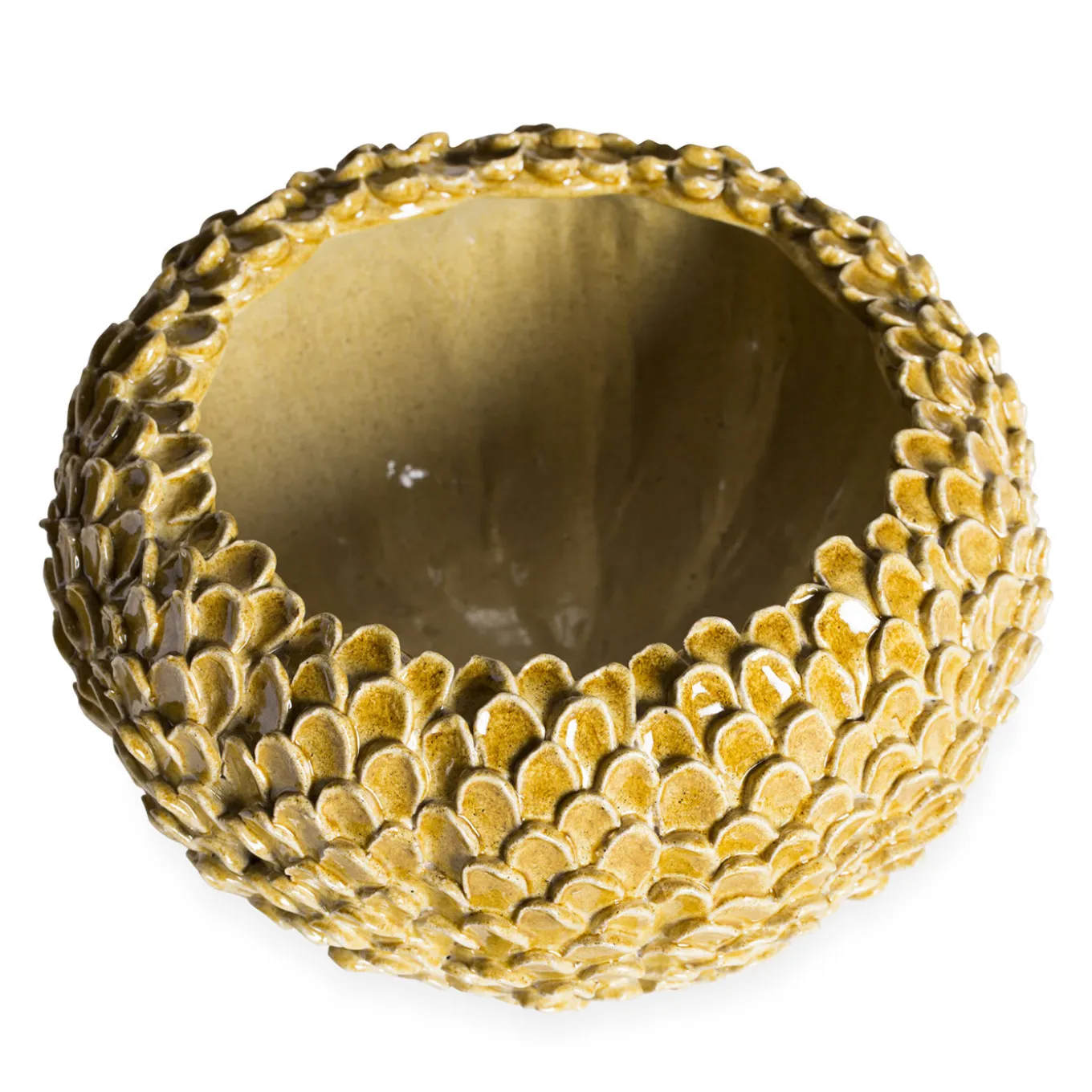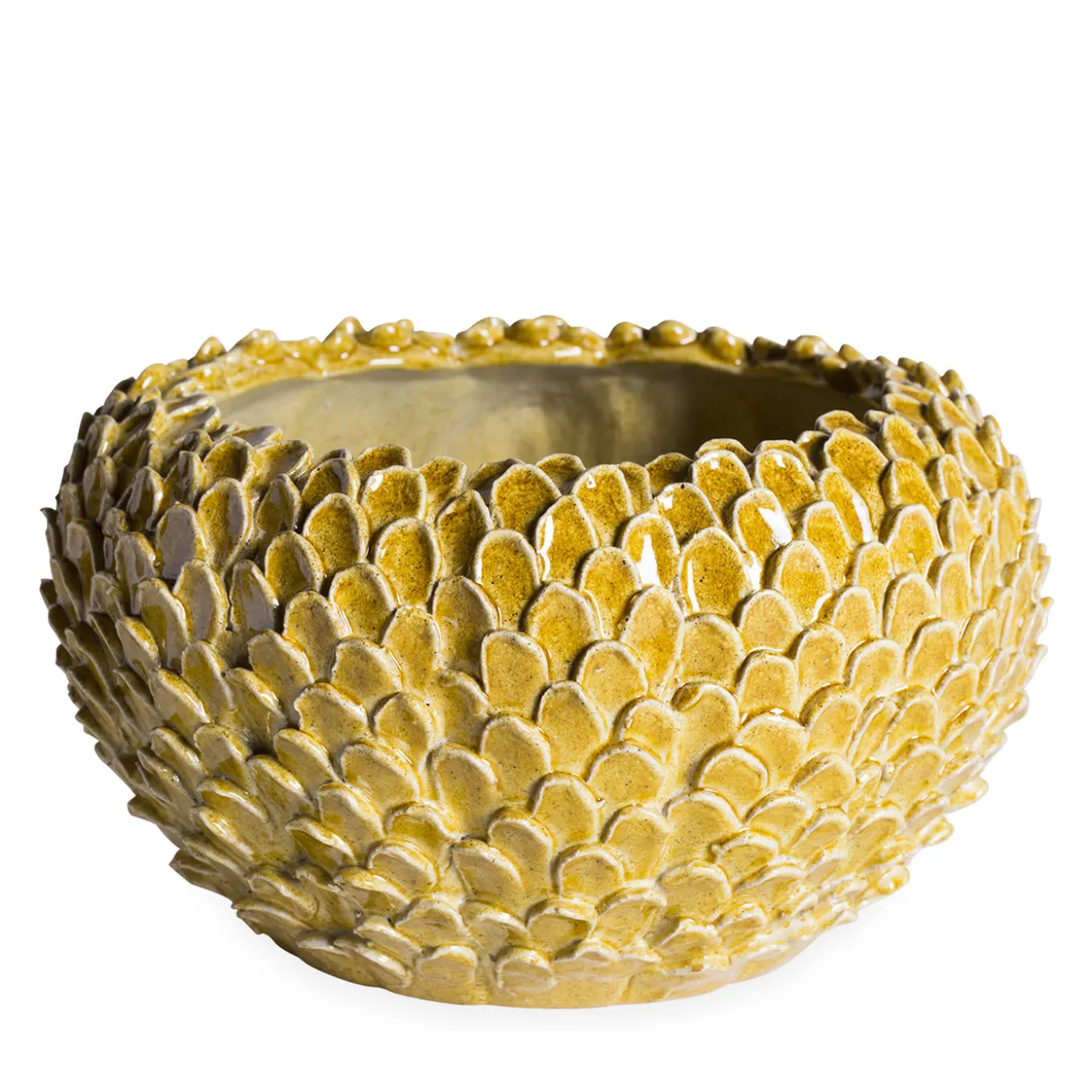 I singoli petali conferiscono una splendida consistenza a questa ciotola in maiolica giallo terra, magistralmente realizzata a mano dagli artisti ceramisti dell’atelier toscano ND Dolfi.