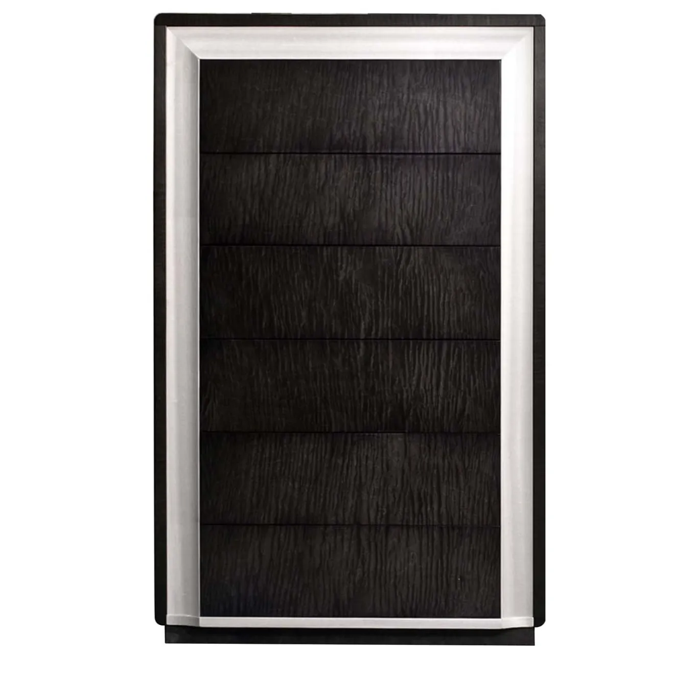 Combinando un elegante minimalismo con i metodi tradizionali utilizzati da secoli nell’ebanisteria di lusso, questo mobile sarà un prezioso complemento d’arredo funzionale che arricchirà qualsiasi ambiente della casa e potrà essere abbinato in camera da letto con il comodino e la cassettiera della stessa collezione Galileo per un look completo. Questo mobile alto con sei cassetti presenta una struttura e un frontale in frise di sicomoro scuro, arricchito da un bordo in legno di pama, per un effetto di contrasto. Il pama è un pregiato legno brasiliano dal colore chiaro e delicato e dalla superficie simile alla seta.