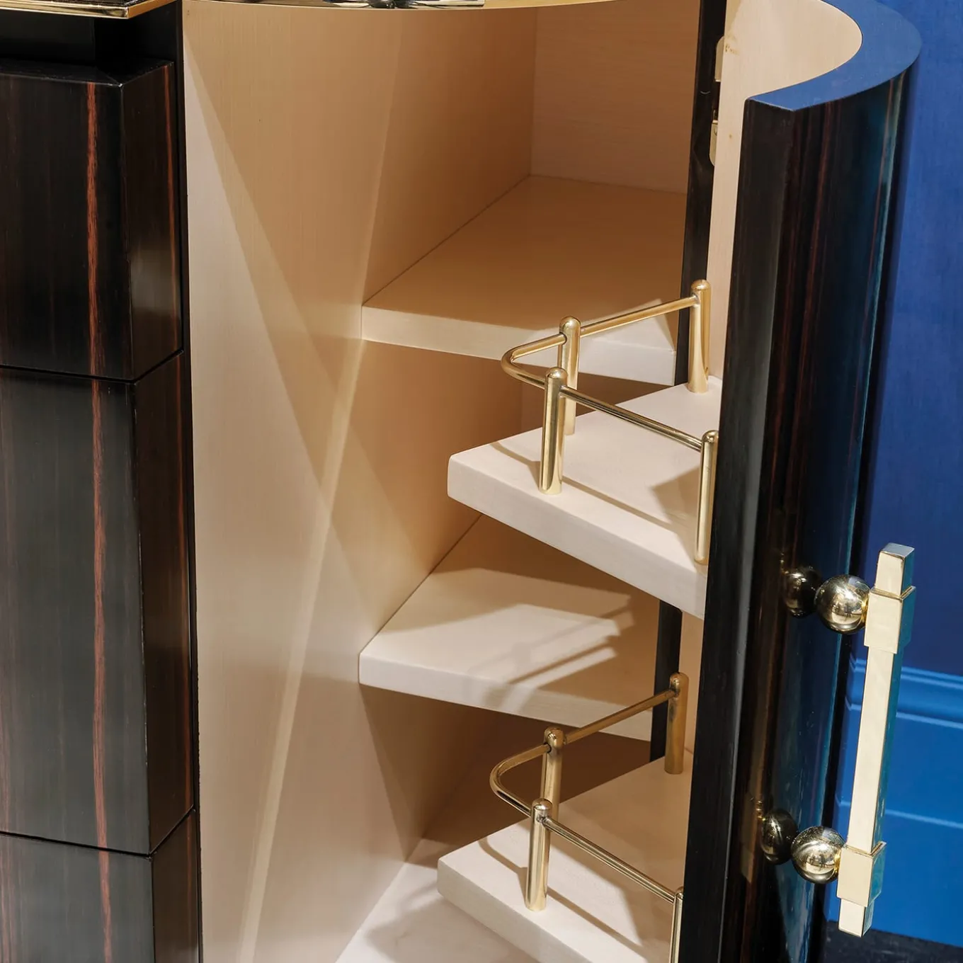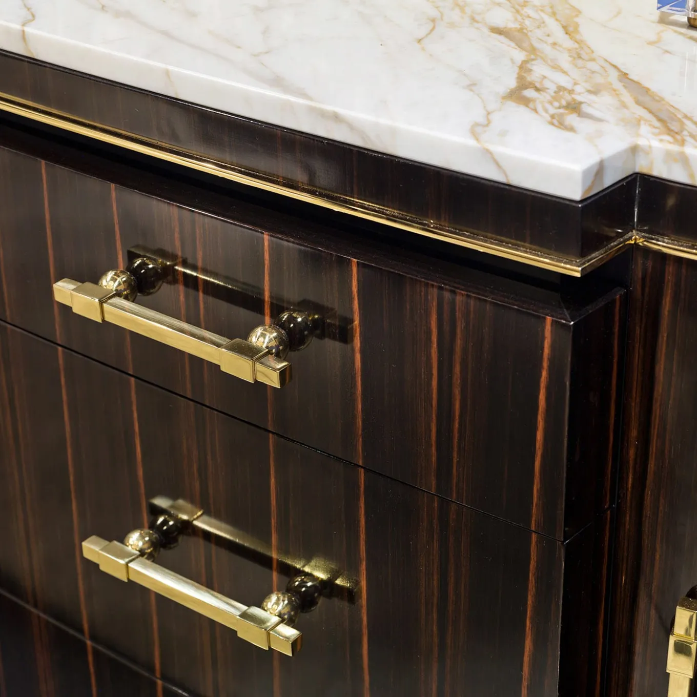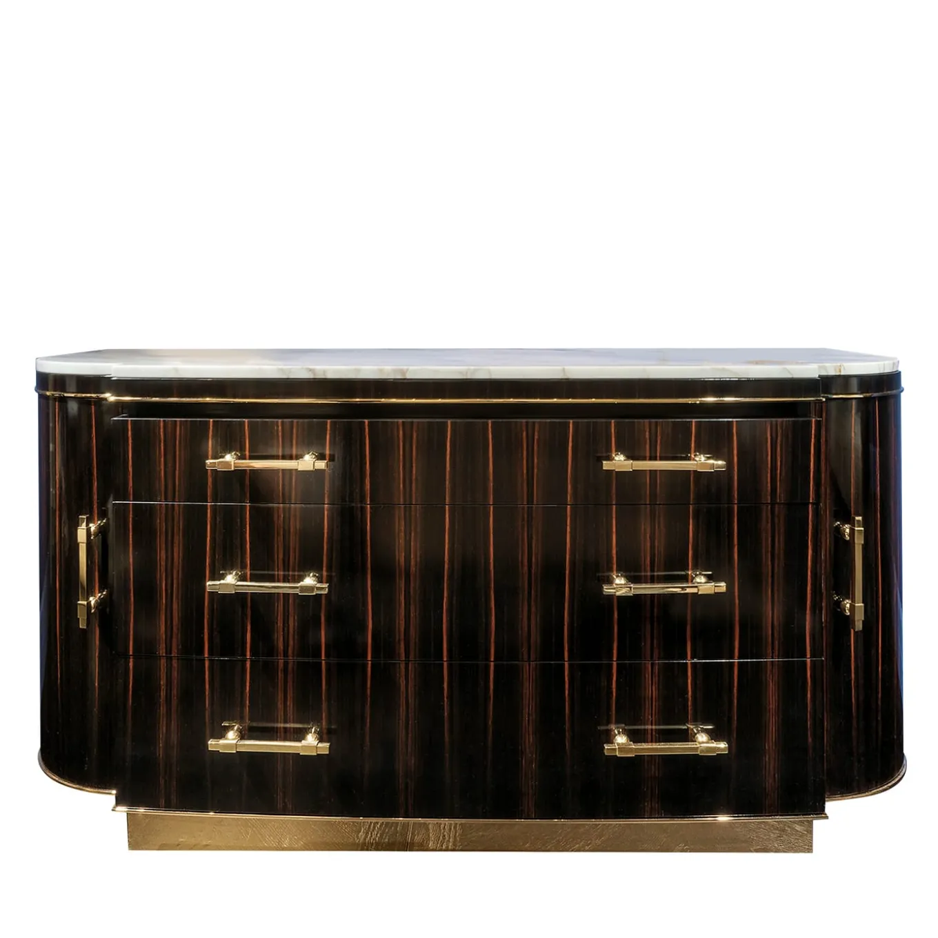 Una magnifica vetrina di artigianato tradizionale e un lussuoso tocco moderno si fondono in questo spettacolare comò, un pezzo iconico per un interno sontuoso. Realizzato in pregiato legno di ebano, con venature naturali di grande impatto visivo, è dotato di tre cassetti e due ante. Arricchito da dettagli in ottone e con un piano in marmo Calacatta di prima qualità.