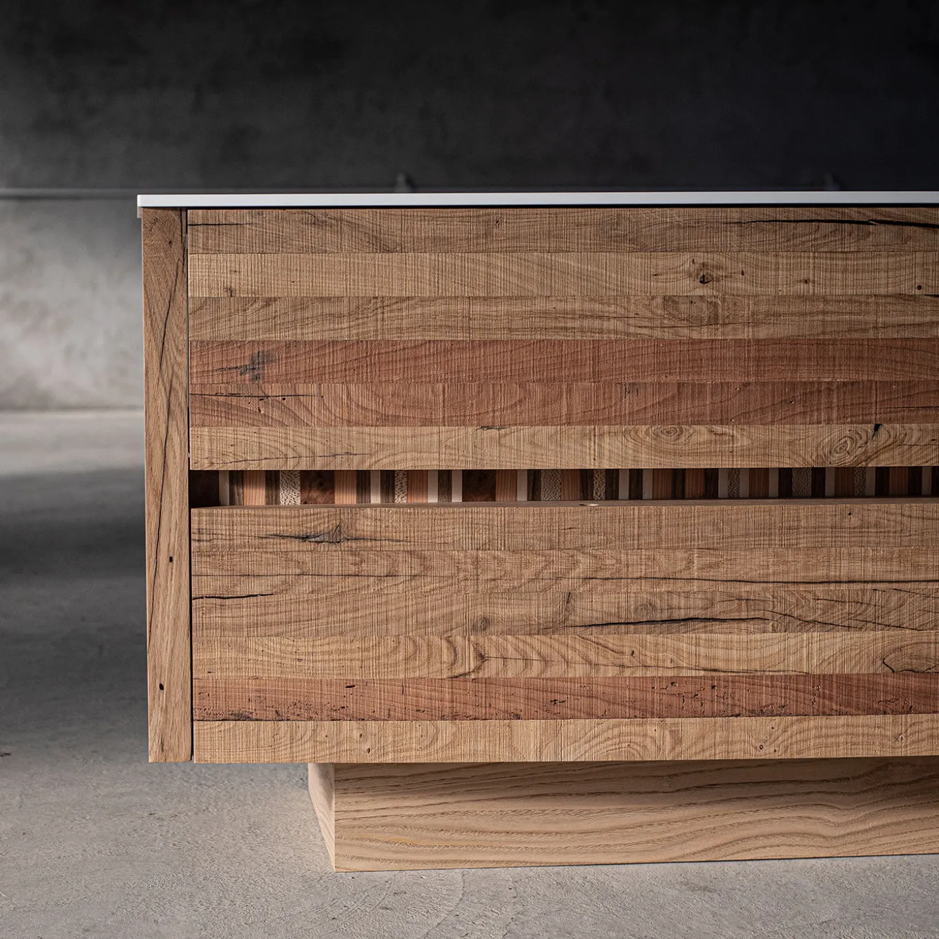 Il comò in legno marrone Tartare presenta un frontale leggermente curvo, texturizzato con un effetto seghettato che conferisce leggerezza e interesse tattile. Tra i cassetti si trova una striscia incassata che mette in mostra intricate intarsi di diversi legni, offrendo un tocco decorativo unico. Le variazioni naturali come movimenti, crepe e cambiamenti di colore sono innate a causa dell’invecchiamento del legno e dei fattori ambientali, rendendo ogni pezzo unico. La superficie superiore è realizzata in Corian con un’opzione di personalizzazione in marmo, contattare il Concierge per ulteriori informazioni.