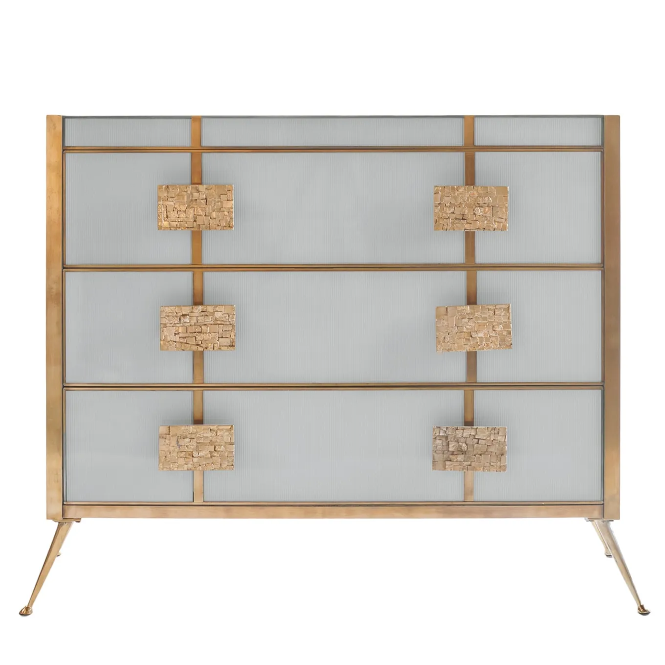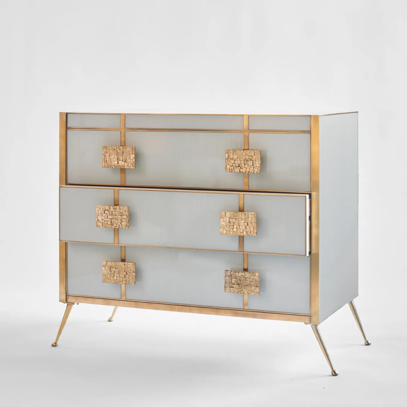 La cassettiera Glass and Brass offre una straordinaria miscela di eleganza e funzionalità, progettata per elevare qualsiasi spazio sofisticato. Caratterizzato da una robusta struttura in legno, questo comò è elegantemente rivestito in vetro scanalato, incorniciato da un profilo in ottone spazzolato che ne esalta la forma geometrica e ne mette in evidenza il design essenziale. Questo pezzo è dotato di tre cassetti spaziosi, che offrono un ampio spazio di archiviazione senza sacrificare lo stile. Le maniglie a mosaico in ottone aggiungono una qualità scultorea e tattile, creando un raffinato contrasto con la trasparenza del vetro. Le gambe affusolate in ottone conferiscono una sottile influenza moderna di metà secolo, assicurando che il design complessivo mantenga un’eleganza senza tempo. Ideale per soggiorni lussuosi, camere da letto o ambienti boutique, questa cassettiera esemplifica la perfetta armonia tra design e artigianato, rendendola una scelta di spicco per qualsiasi interno sofisticato.