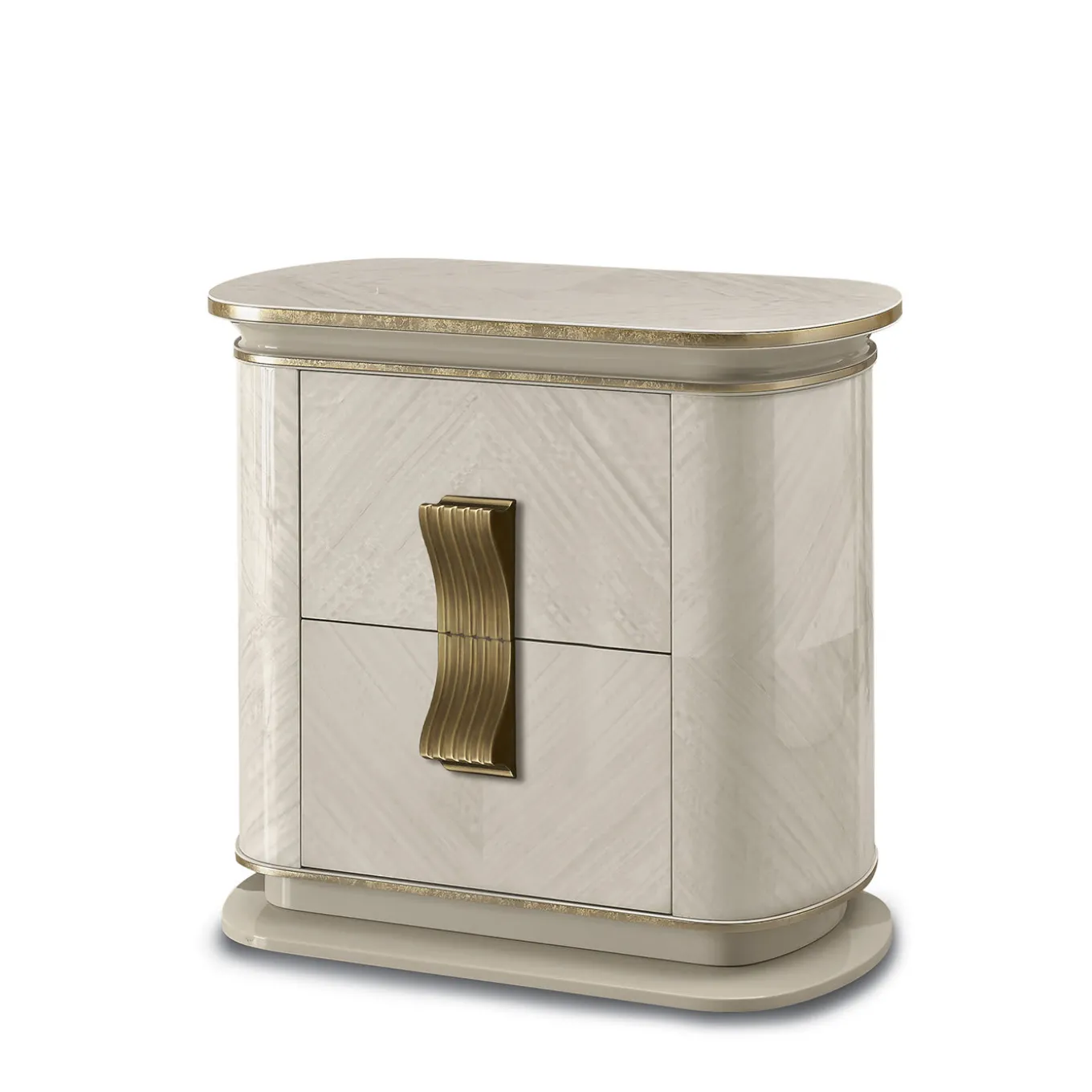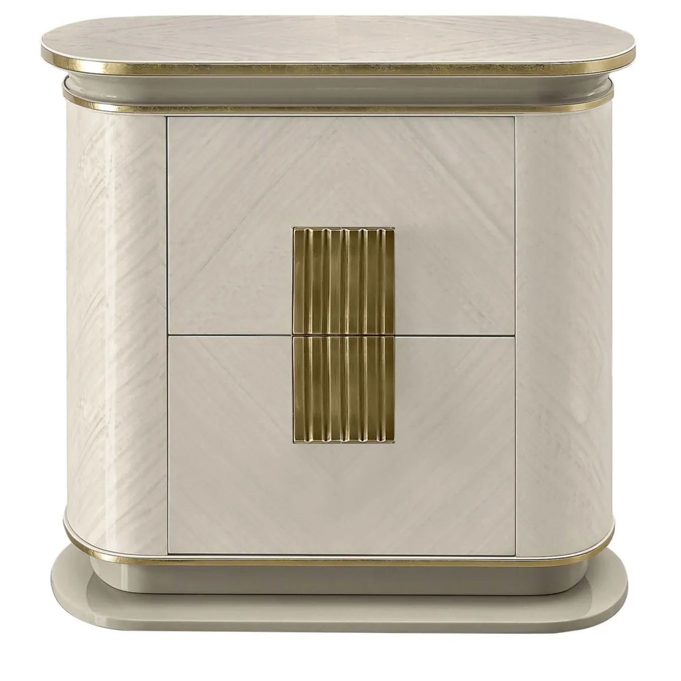 Questo comodino di grande effetto infonderà a qualsiasi camera da letto una delicata raffinatezza, soprattutto se abbinato agli altri pezzi della stessa serie. L’elegante struttura in compensato e MDF rivestito di eucalipto bianco è arricchita da un intarsio a forma di diamante e da dettagli in metallo con finitura dorata. I due cassetti sono dotati di un sistema divisorio Blum.