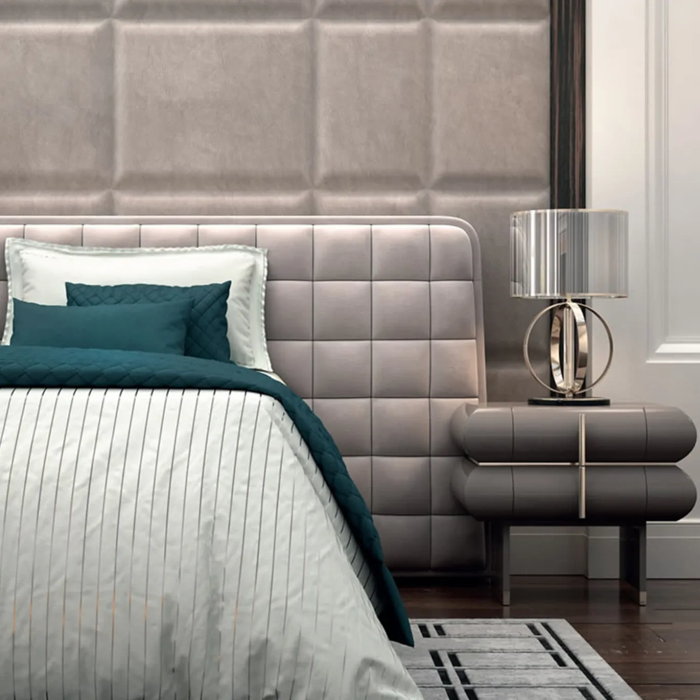 Combinando squisitamente linee essenziali e dettagli di lusso, questo elegante comodino è un pezzo eccezionale, ampiamente personalizzabile sia nelle finiture che nei rivestimenti e nei colori. Laccato in una tonalità di grigio intenso per un risultato estremamente raffinato, l’intera struttura poggia su due sottili pannelli di legno arricchiti da un bordo rifinito in ottone e comprende due cassetti, con delicate maniglie verticali nella stessa finitura. Un ulteriore dettaglio in ottone segna il punto di raccordo tra le due scocche dei cassetti a forma di cuscino. Per informazioni su altre finiture e colori, rivolgersi al Concierge.