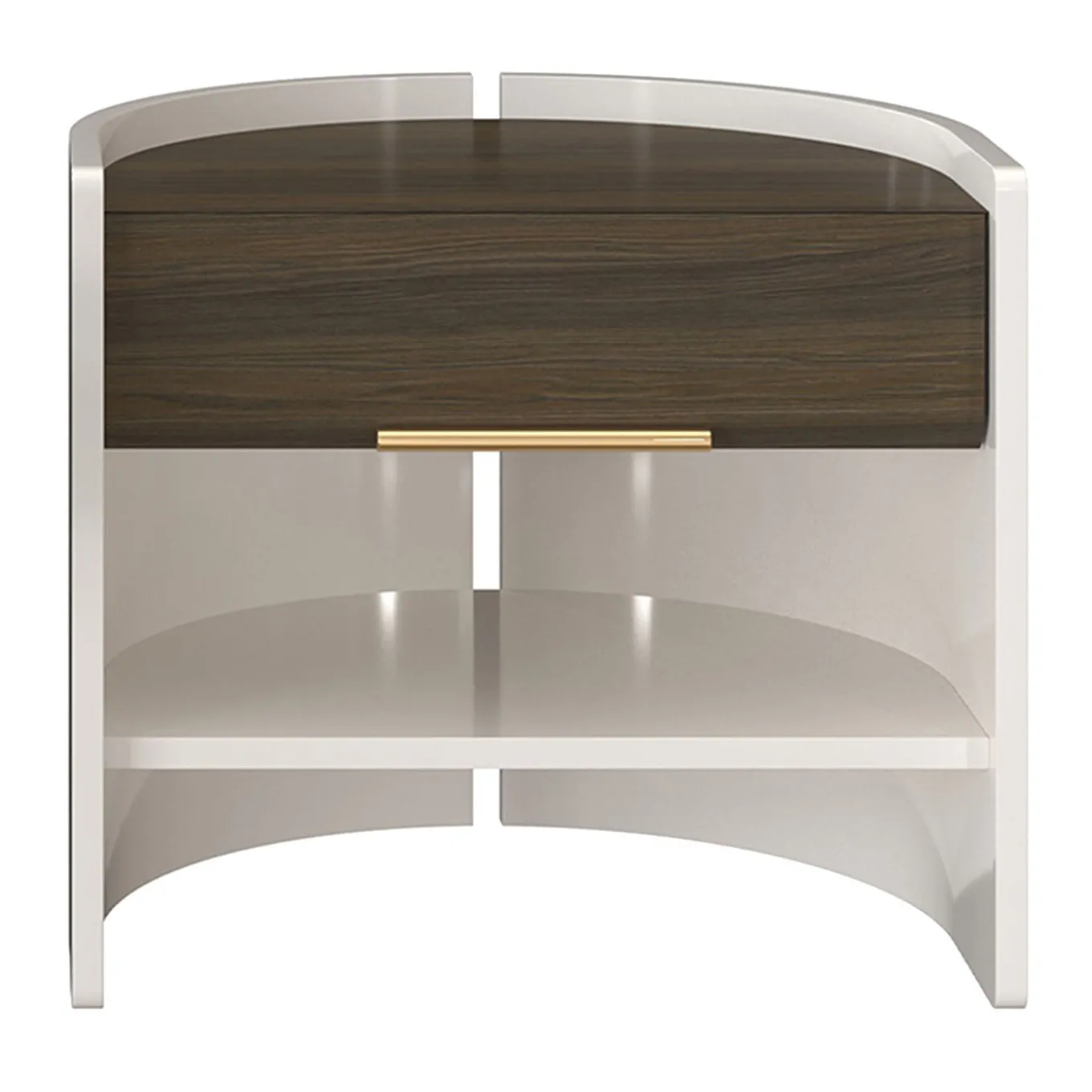 Caratterizzato da una struttura curvata laccata, questo comodino presenta un cassetto impiallacciato in legno con un’elegante maniglia metallica con finitura verniciata. Dotato di una mensola inferiore, garantisce uno spazio di stoccaggio funzionale senza rinunciare a un design raffinato ed elegante, perfetto per diversi stili d’arredo.