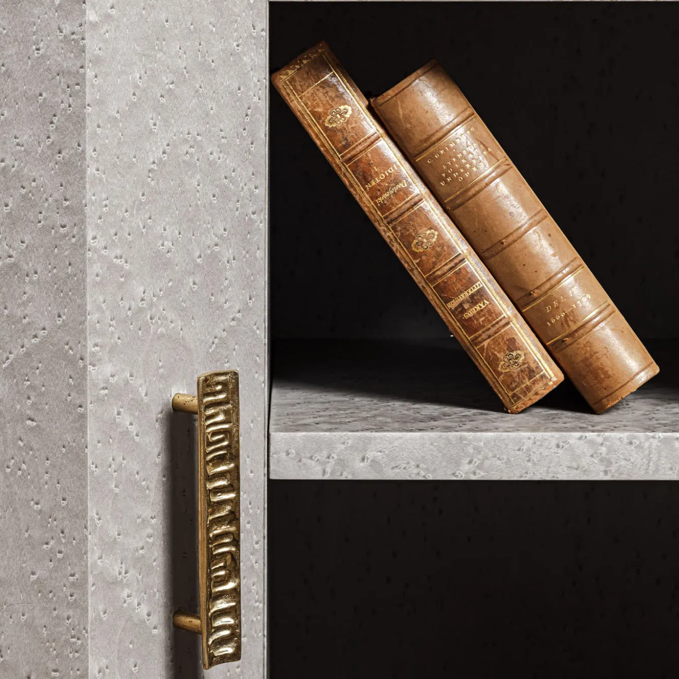 Comodino in acero e eucalipto frisè con maniglie in ottone.