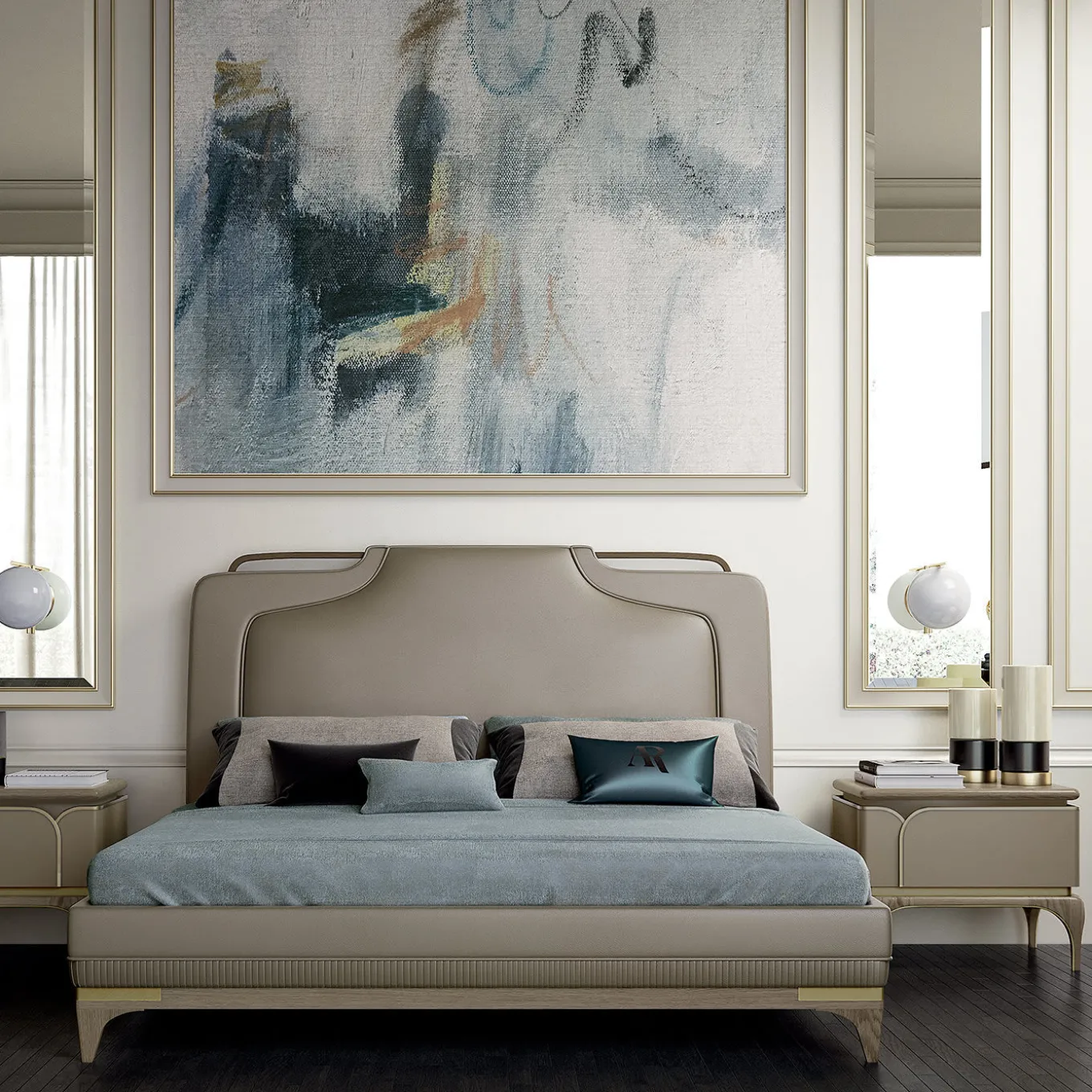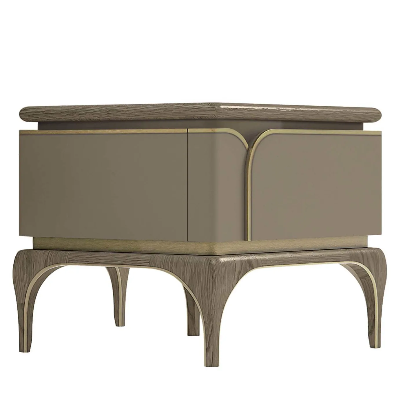 Parte dell’elegante e unica collezione di mobili per la camera da letto, questo splendido comodino sarà un’aggiunta funzionale e glamour all’arredamento moderno. La sua struttura in multistrato e MDF impiallacciato in frassino è sostenuta da una base in frassino massiccio fiammato arricchita da un profilo in ottone brunito. I cassetti sono dotati internamente di sistema di chiusura blum.