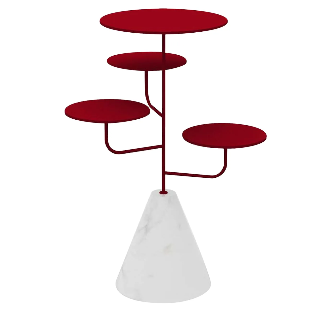 Soluzione ideale per favorire la convivialità attraverso la condivisione, questo raffinato portavivande a quattro livelli vanta una silhouette scultorea composta da bracci ramificati che si estendono da una superba base conica in marmo bianco di Carrara. Ciascuno dei quattro piani circolari incorporati nella struttura in ferro laccato rosso rubino si trova a un’altezza diversa, garantendo funzionalità e dinamismo visivo. Si prega di informarsi presso il Concierge per altre opzioni di colore e marmo.
