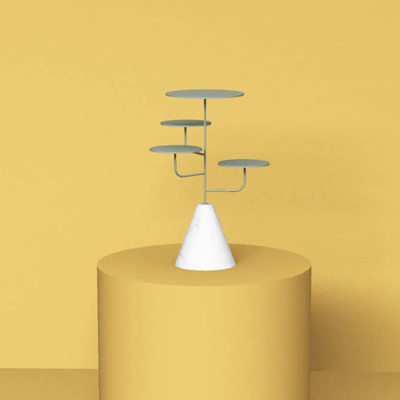 Questo esclusivo portavivande a quattro livelli in ferro laccato verde salvia è un’attualizzazione del concetto di condivisione, che si dà il caso sia favorito dal cibo come fattore culturale. Quattro piani rotondi sostenuti da altrettanti bracci si estendono con grazia in una silhouette ramificata che poggia su una base conica realizzata in marmo bianco di Carrara. Il design è disponibile in altre opzioni di colore e di marmo; chiedete al Concierge per i dettagli.