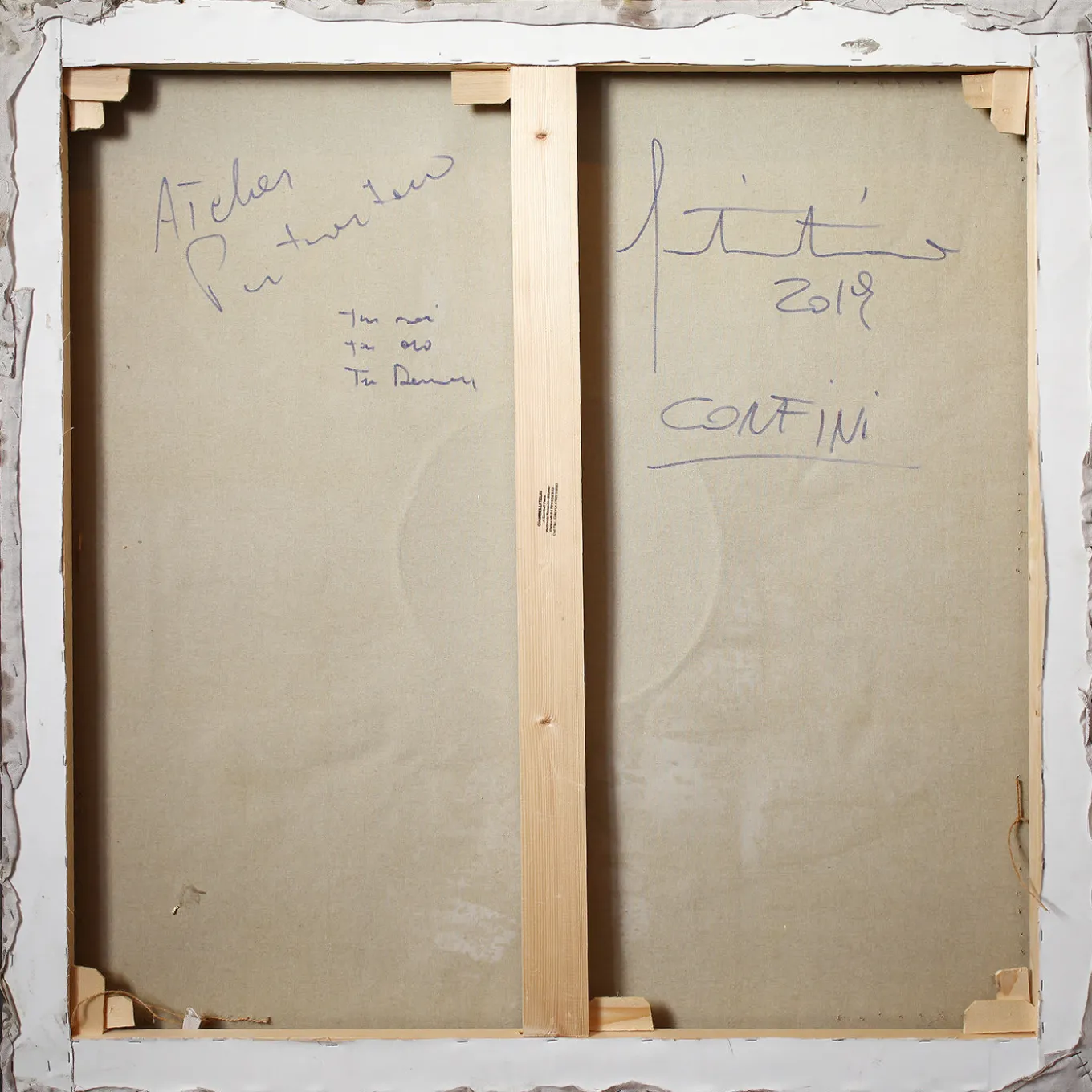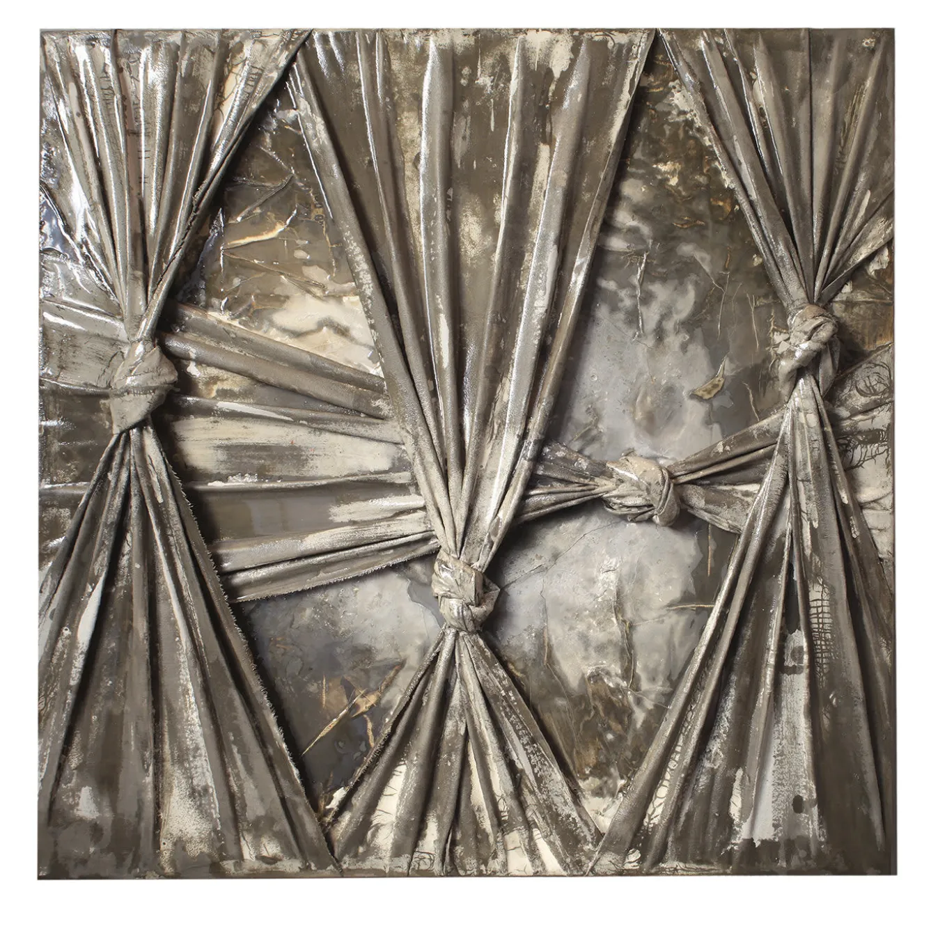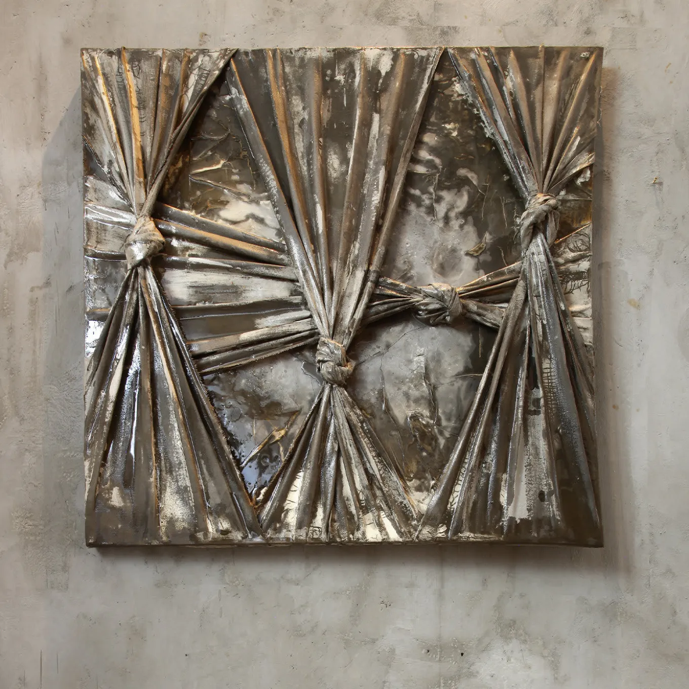 Singolare interpretazione del concetto di “confine”, questa tecnica mista è composta da tessuto annodato su cemento resinato. Impreziosite da una tonalità marrone, le suggestive forme create dai nodi emanano un senso di soffocamento e restrizione. L’opera è ispirata ai numerosi viaggi dell’artista Fabio Pietrantonio in tutto il mondo e al suo legame con le comunità indigene.
