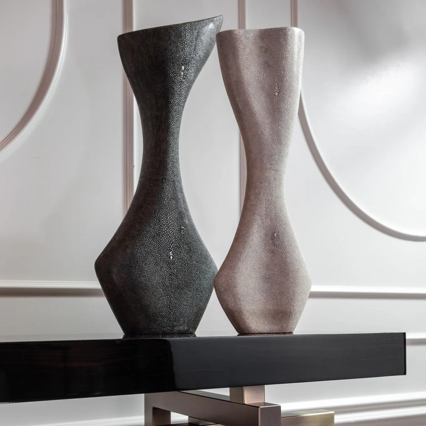 Splendida da tutti i lati, questa consolle scultorea vanta un design unico che può essere sfoggiato come pezzo forte al centro di una grande stanza o di un loft per creare una divisione visiva e spaziale. Il piano rettangolare di 7 cm di spessore in legno impiallacciato in ebano Macassar lucido poggia su un’intrigante base in metallo bronzato composta da due quadrati intersecati da un rettangolo. Elegante superficie per l’esposizione di audaci oggetti decorativi, la silhouette lineare di questa accattivante consolle rivela una costruzione impeccabile, frutto di una maestria artigianale e di un’estetica innovativa.