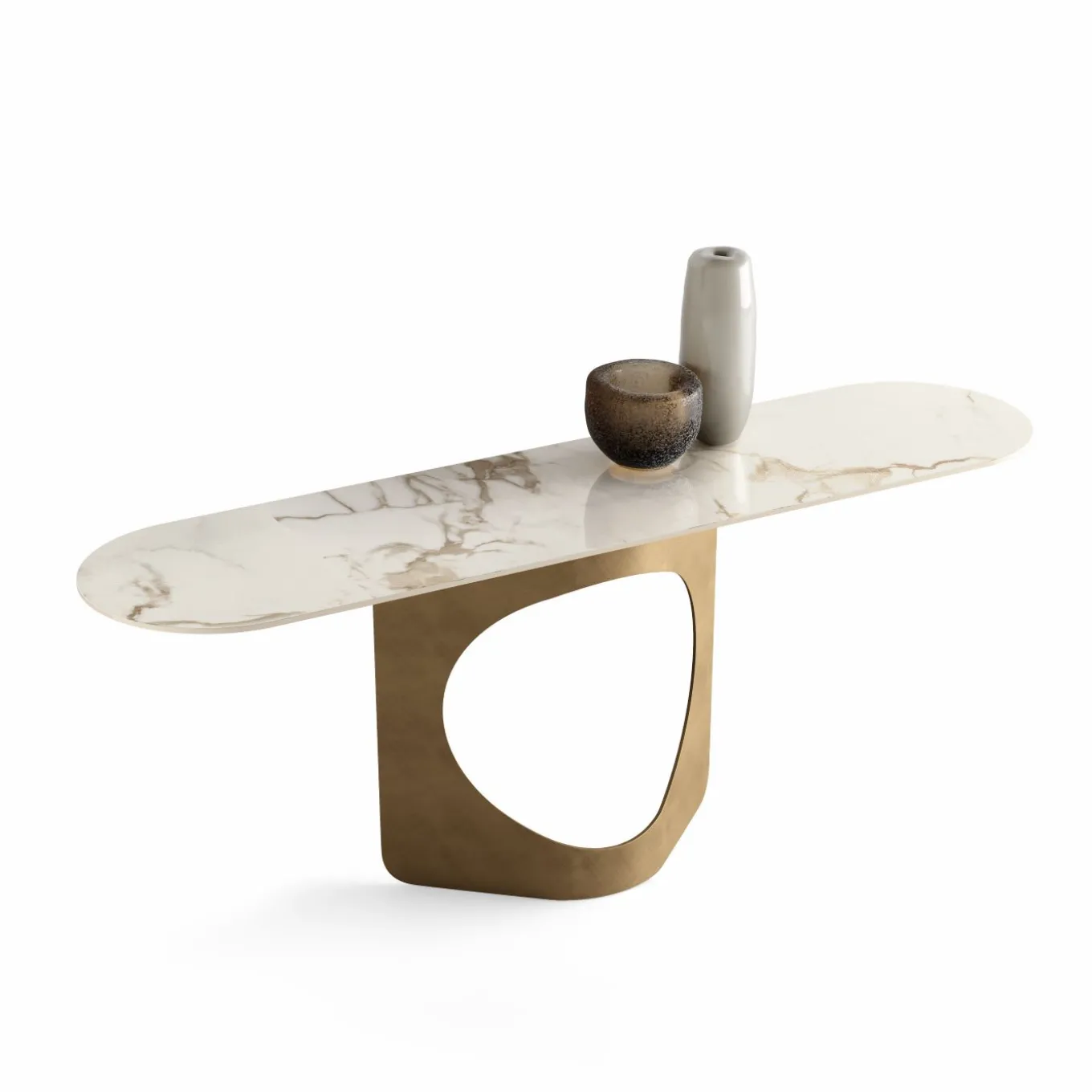Inconfondibilmente contemporanea nelle sue linee fluide arricchite da accenti geometrici, questa consolle troverà posto in eleganti ingressi. Il piano in gres di 1,2 cm di spessore, con uno splendido effetto marmorizzato che ricorda il marmo Calacatta macchia vecchia e un bordo a tutta massa, si trova sopra la scultorea base in metallo con finitura bronzo, curvata e rifinita da un ampio cerchio tagliato di grande impatto visivo.