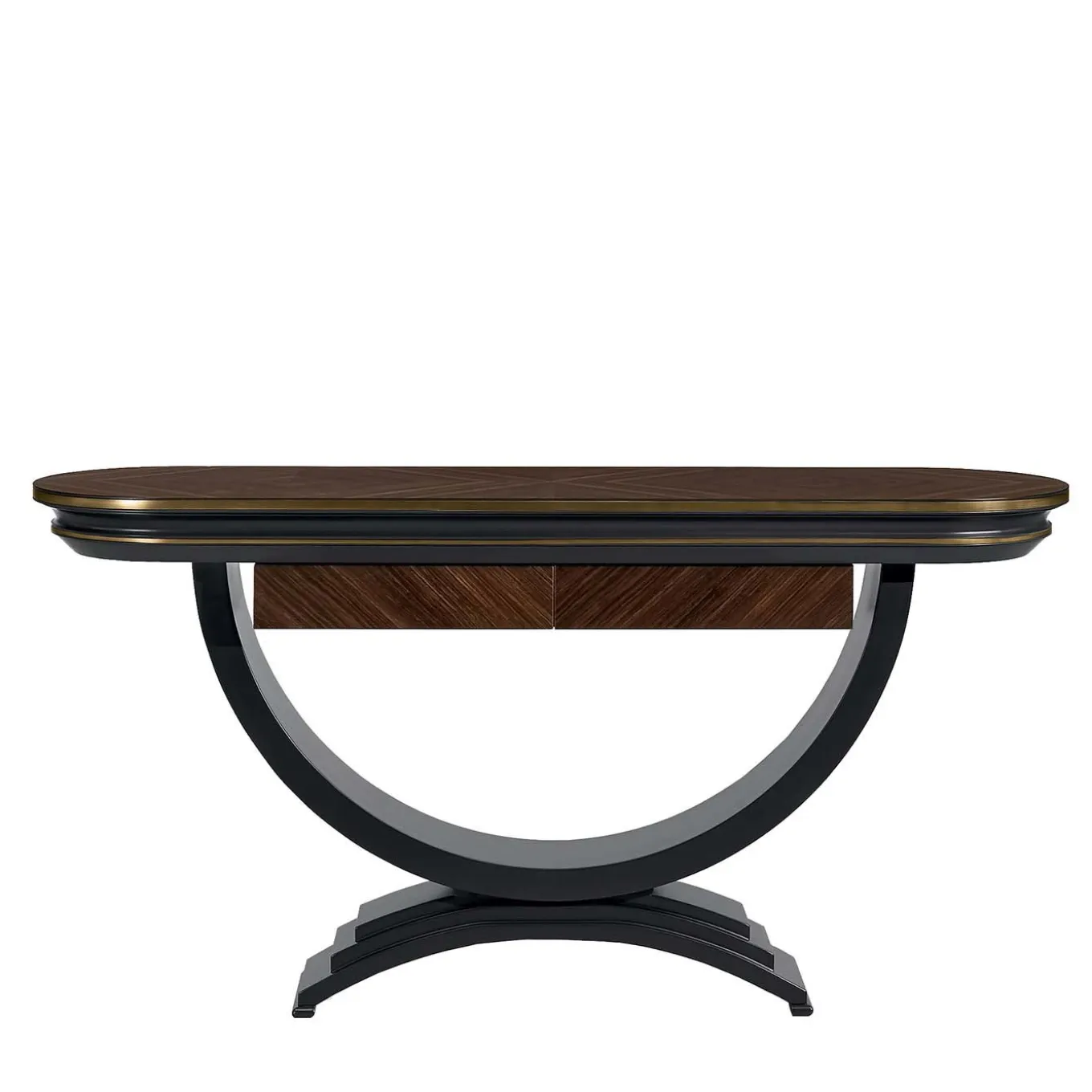 Curve aggraziate ed eleganti contraddistinguono questa splendida consolle magistralmente realizzata con una struttura in multistrato e MDF impiallacciato in palissandro indiano impreziosita da un profilo in metallo con finitura dorata. L’accattivante base sostiene un piano rettangolare dai bordi arrotondati con due cassetti frontali dotati di sistema di chiusura blum. Chiedere al Concierge le opzioni in legno di eucalipto bianco.