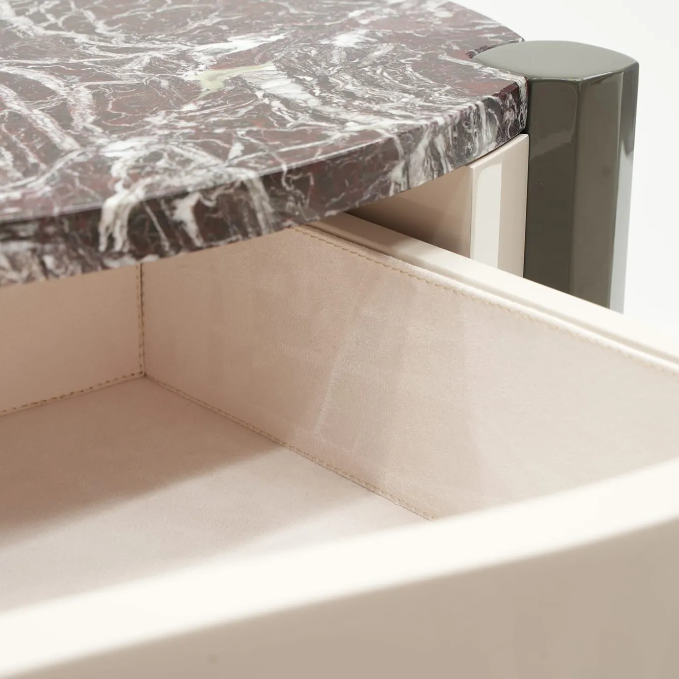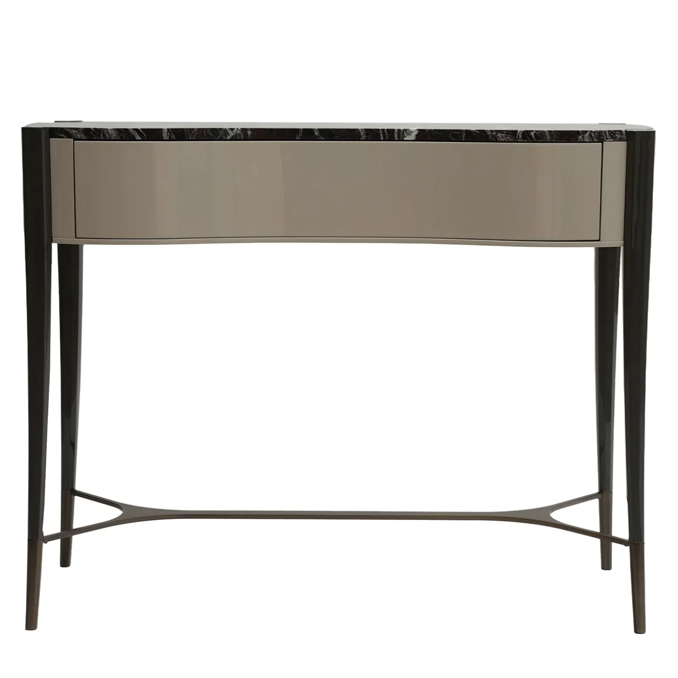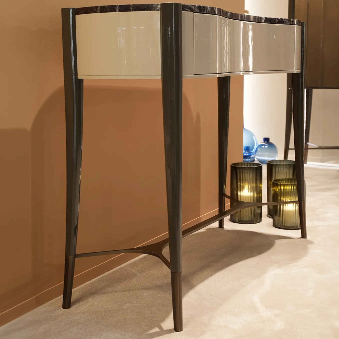Linee aggraziate caratterizzano questa preziosa consolle della collezione Caleido, un’aggiunta superba a ingressi esclusivi in stile moderno. La struttura in legno laccato, proposta in una delicata tonalità grigio-pietra, è caratterizzata da elementi metallici bronzati spazzolati che aggiungono un tocco di eleganza e leggerezza all’intera struttura. Un pregiato piano in marmo è disponibile su richiesta al Concierge.