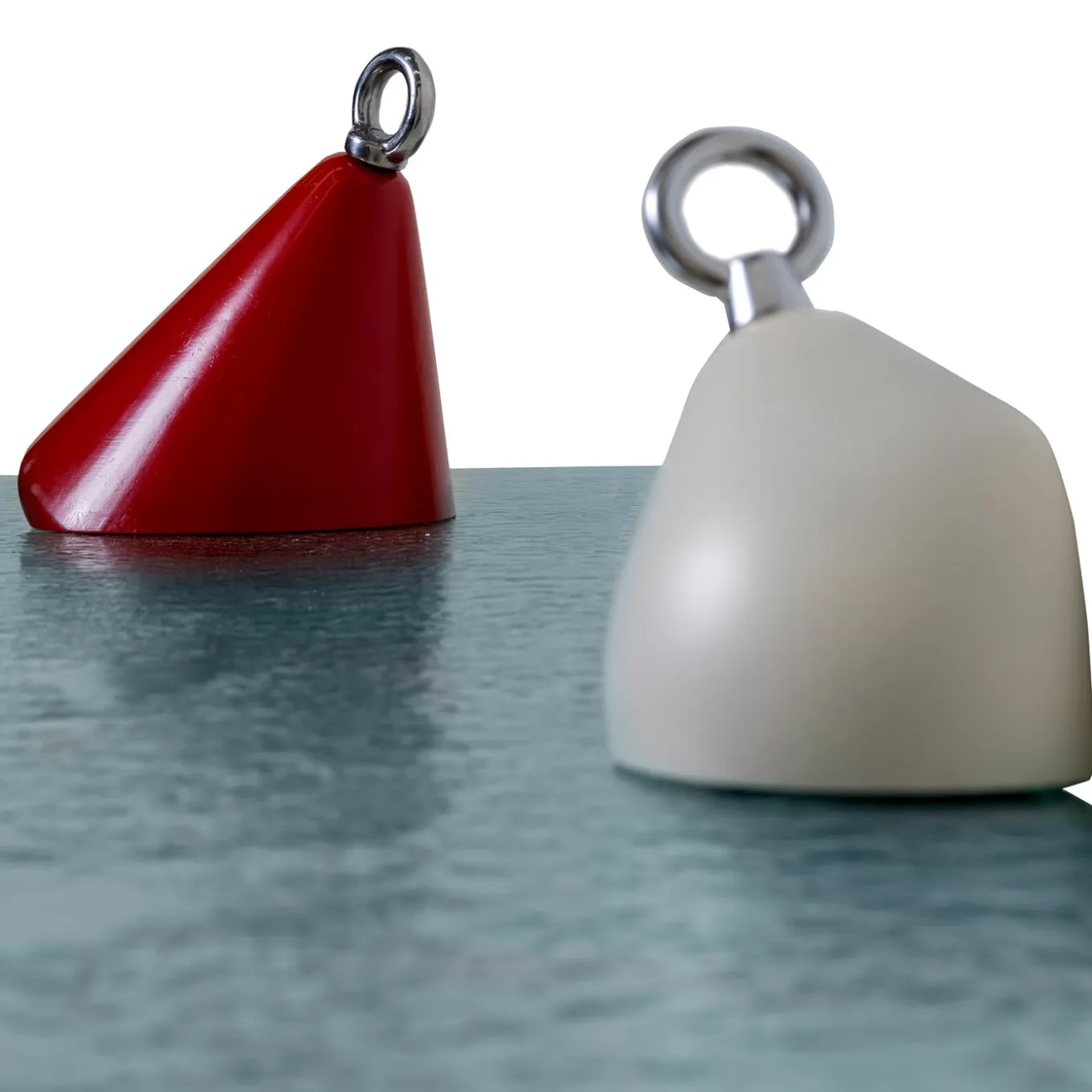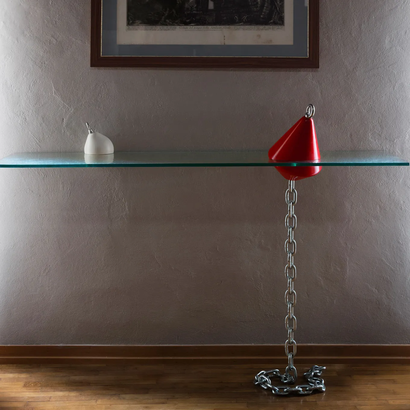 Cercando di sensibilizzare l’opinione pubblica sull’inquinamento da plastica, sorprendendo per il suo equilibrio sfidante e per i suoi colori estivi e brillanti, la console boa sembra galleggiare da terra come se fosse realmente immersa nel mare. La catena d’acciaio che funge da sostegno principale del pezzo, invece di essere appesa, è saldata insieme come un’intera colonna. Il piano in vetro su misura ad effetto acqua è appeso sia sopra la catena sia fissato alla parete attraverso un piccolo gancio nascosto all’interno della boa bianca più piccola.