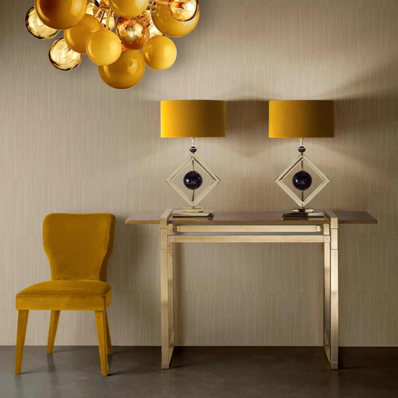 Quest’opera d’arte scultorea funge anche da consolle per aggiungere un accento opulento e di ispirazione Art Déco a un interno raffinato. La struttura è interamente realizzata con aste di ottone che si collegano formando una silhouette di grande effetto. Un piano in marmo oro imperiale completa quest’opera d’arte.