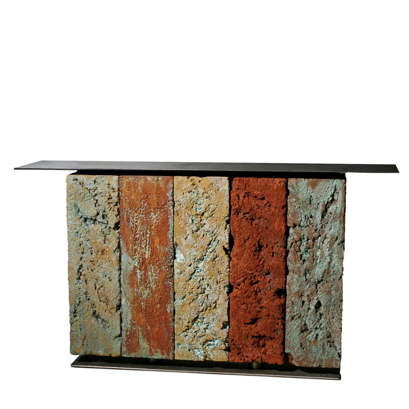 Distinguendosi per l’artigianato scultoreo e l’esplorazione artistica delle ossidazioni metalliche, questa superba console è una vera meraviglia. I cinque solidi di uguali dimensioni emanano personalità distinte, con i loro colori unici e intensi che raccontano storie di epoche passate. Realizzati in acciaio bronzato, il piano e la base sono eleganti e durevoli. Personalizzabile sia nelle dimensioni che nel numero di elementi, ogni console è una creazione su misura per elevare qualsiasi spazio con la sua straordinaria presenza.