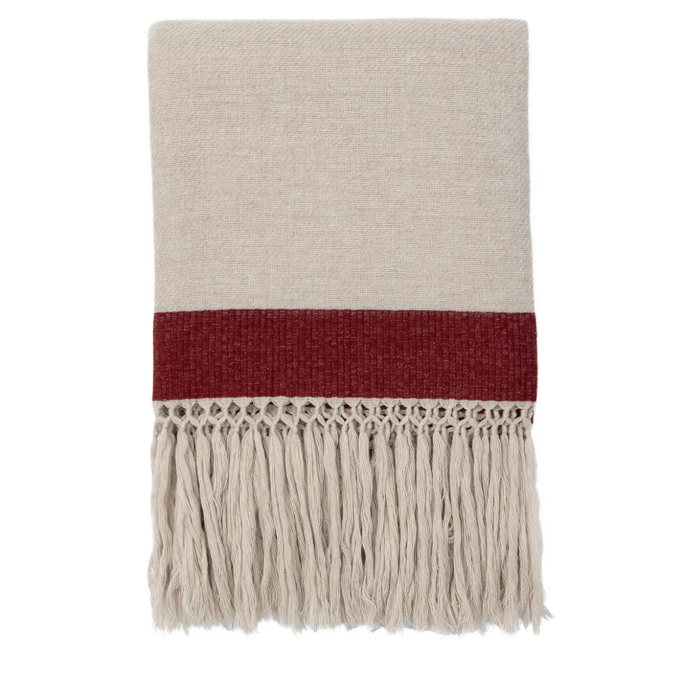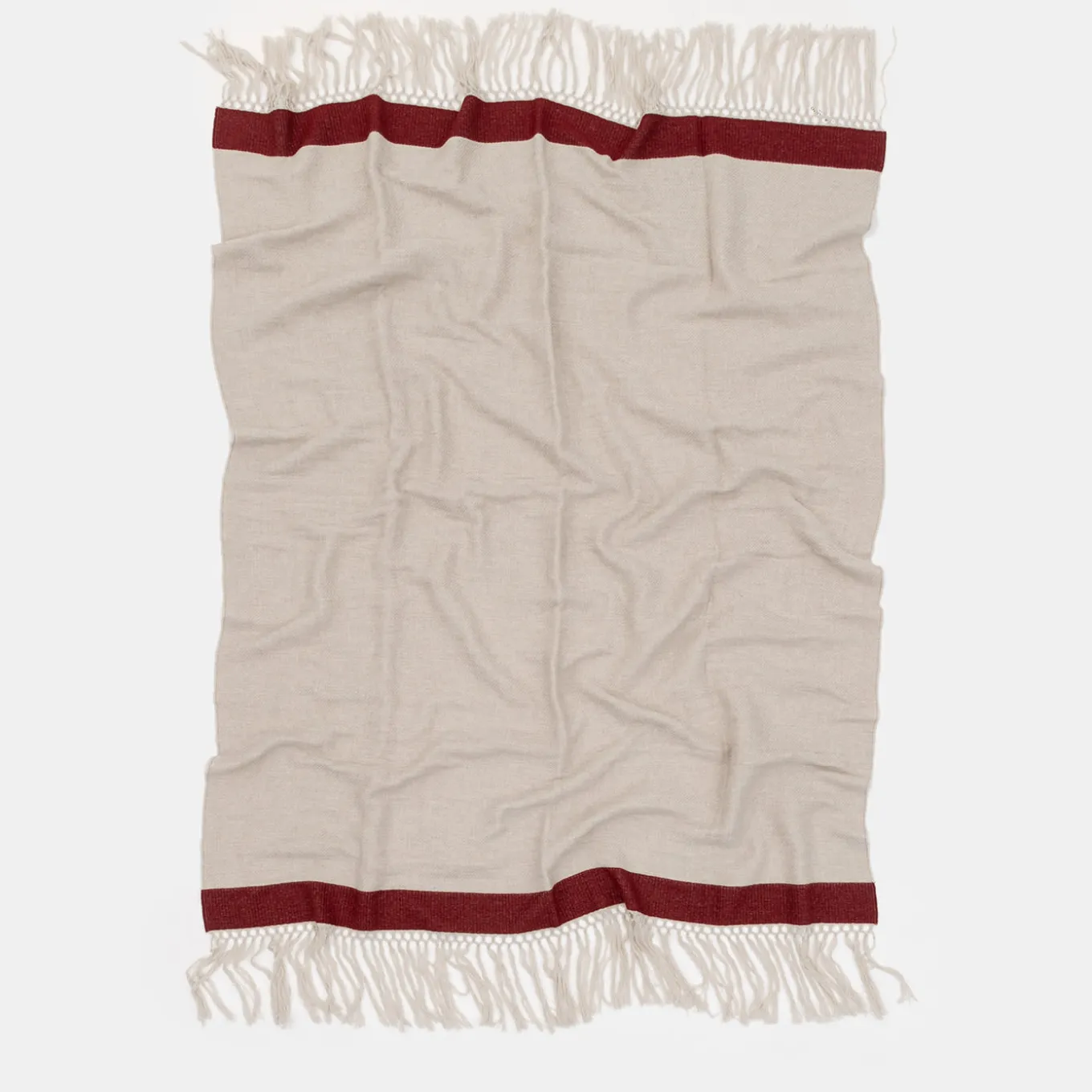 Preziosi filati di pregiata lana Merino sono stati minuziosamente selezionati per realizzare questa sofisticata coperta. Animata da frange lunghe 20 cm abilmente annodate a mano, il suo design semplice e raffinato acquista un tocco di colore grazie all’aggiunta di una fascia decorativa rosso intenso. Un alleato fidato per esaltare i momenti di puro relax, è disponibile in più varianti di colore.