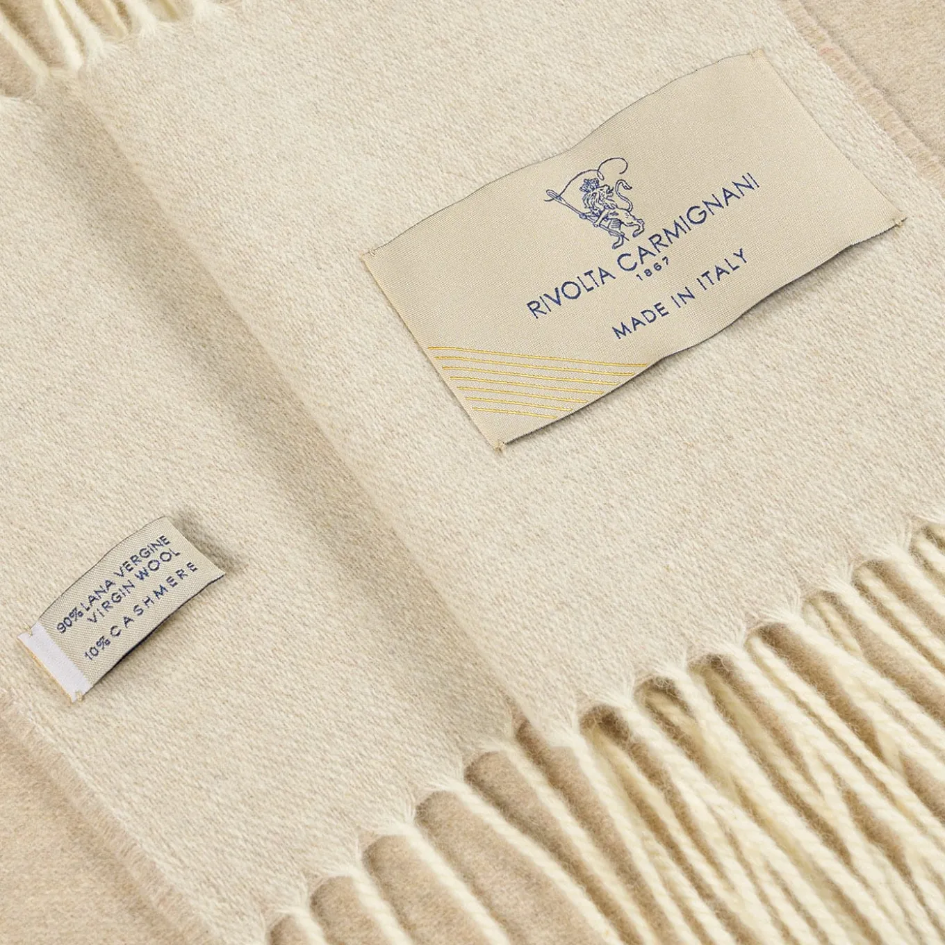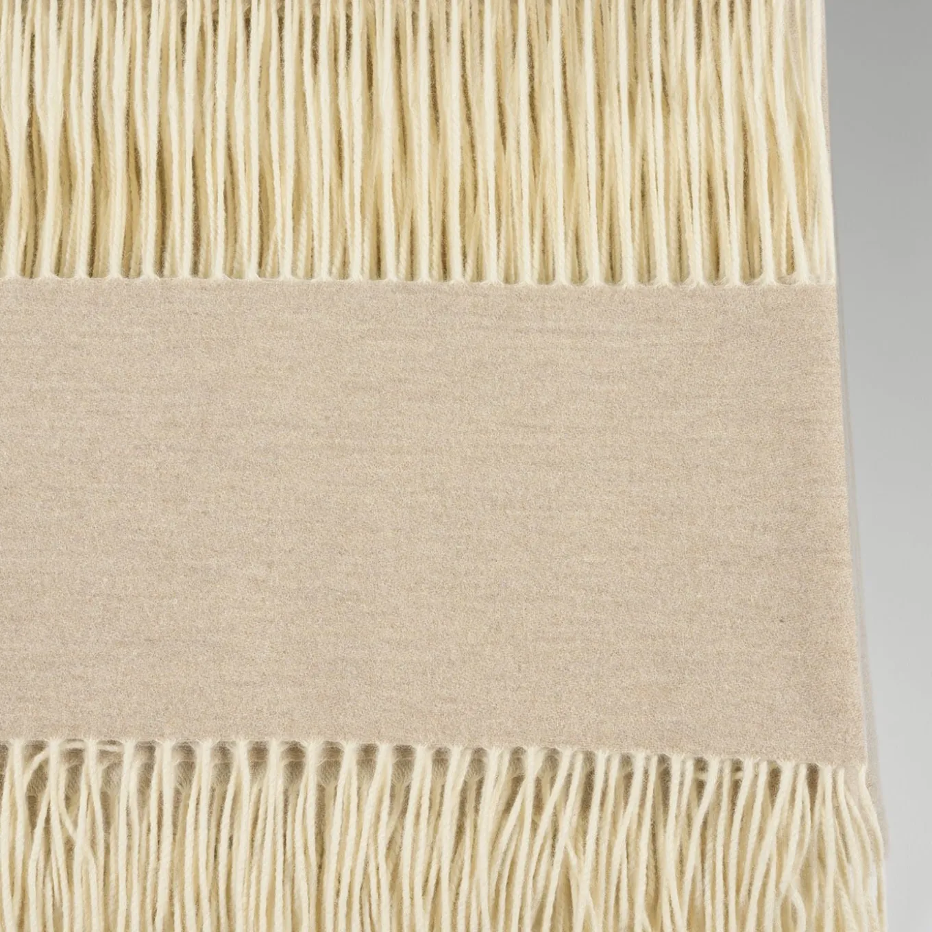 Un pezzo che resiste solo al lavaggio a secco, questa piccola coperta beige della collezione Defilé si distingue per un disegno traforato di fili sciolti ispirato all’antica tecnica toscana in cui si sfilacciavano i filati di lino dei corredi più preziosi. Il pezzo, ulteriormente accentuato da frange, combina il 90% di lana Merino e il 10% di cashmere per un calore e una morbidezza senza sforzo.