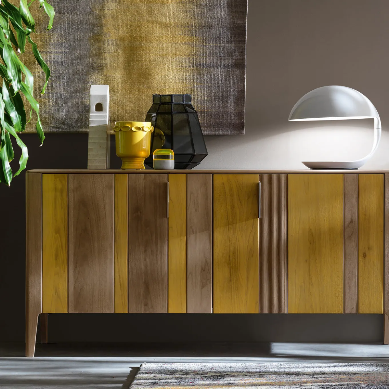Realizzata in legno di noce canaletto, la credenza Domino è dotata di due ante con macchie di colore giallo e olmo a righe che esaltano le venature naturali del legno. Pratica, la credenza è dotata di ripiani in vetro che consentono di riporre libri, piatti o altri accessori per l’intrattenimento. La credenza è disponibile in diverse combinazioni di colori.
