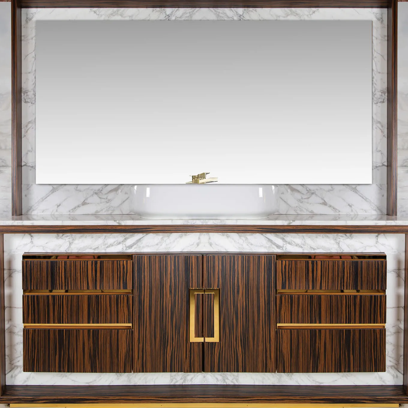 La credenza Frame in noce massello coniuga lo stile contemporaneo con l’artigianato Made in Italy. La cornice racchiude e protegge il marmo Arabescato in una preziosa teca di legno e metallo e lo fa risaltare con un sistema di illuminazione interna dedicato. La credenza è composta da due ante, con ripiani interni regolabili in altezza, e da sei cassetti, tre per lato. Sopra la credenza, uno specchio strutturato in legno con inserti in marmo Arabescato. Chiedere al concierge per le opzioni di personalizzazione.