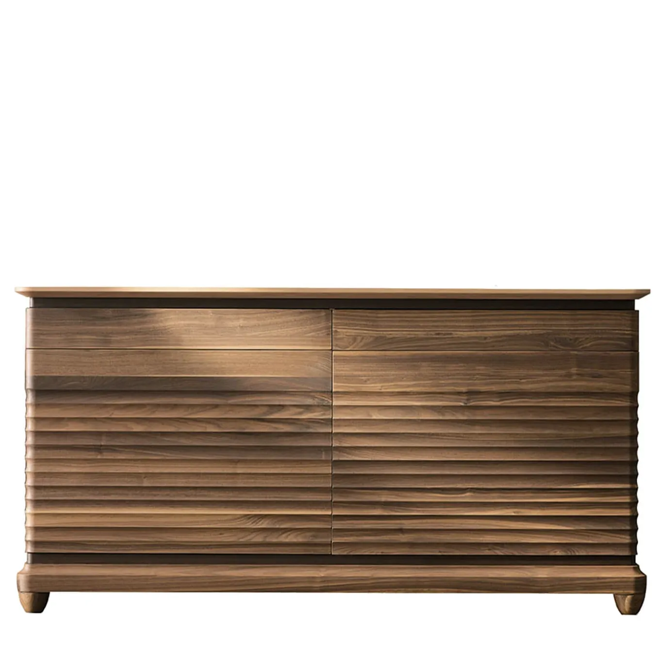 Design contemporaneo e anima classica. Questa credenza in legno massello è il risultato della maestria e della passione dei nostri artigiani. Il delicato fronte ondulato crea un raffinato contrasto tra luci e ombre: in questo modo, il mobile appare diverso e più suggestivo a seconda della prospettiva.