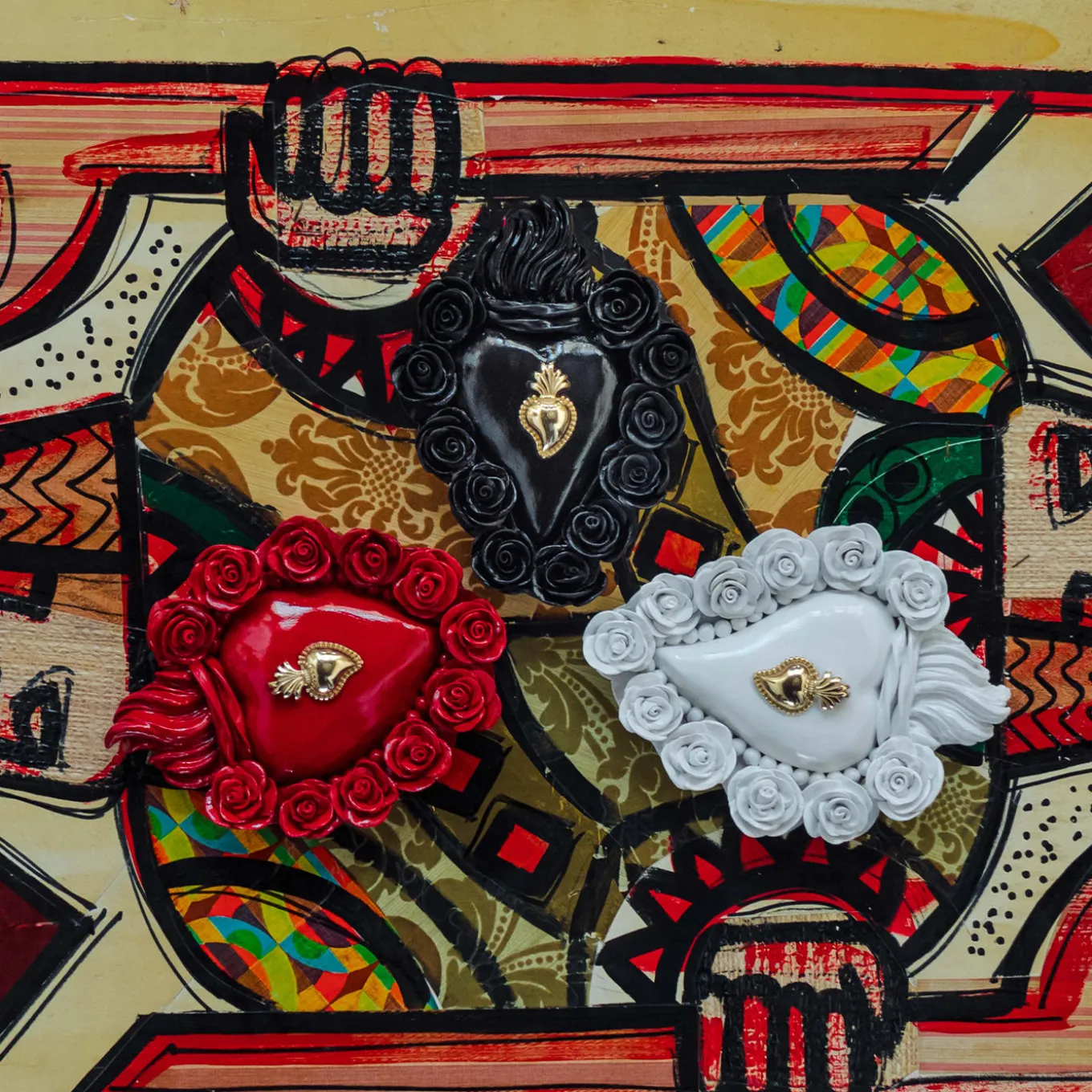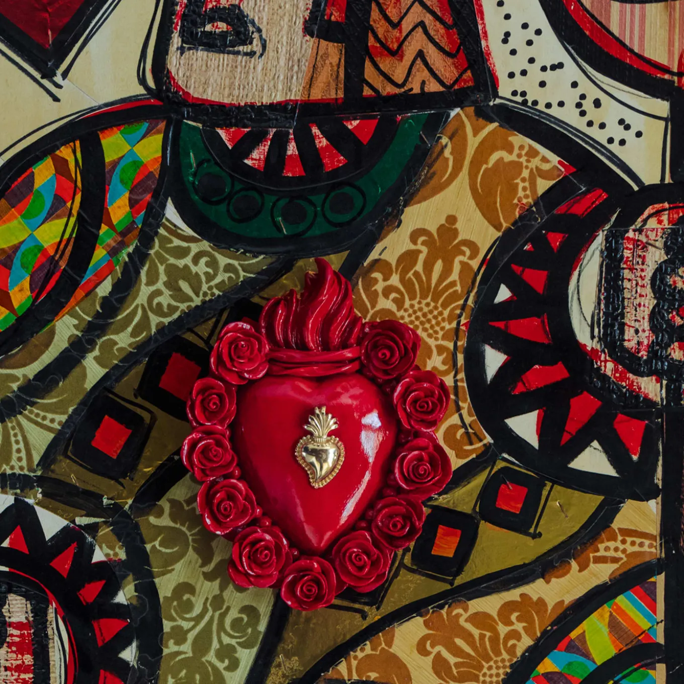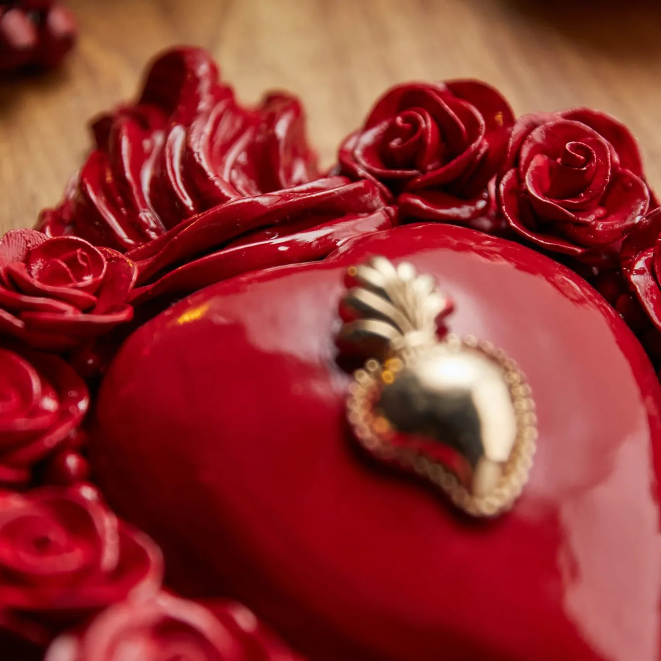 Elegante omaggio agli ex voto italiani e ai cuori sacri messicani, questa affascinante ceramica rifinita con smalto rosso presenta un cuore in metallo lucido, un filo di perle rosso fuoco e uno splendido motivo di rose rosse lungo i bordi. Sofisticata opera di maestria artigianale, questo pezzo straordinariamente romantico si presta a essere esposto con altri elementi della stessa collezione.