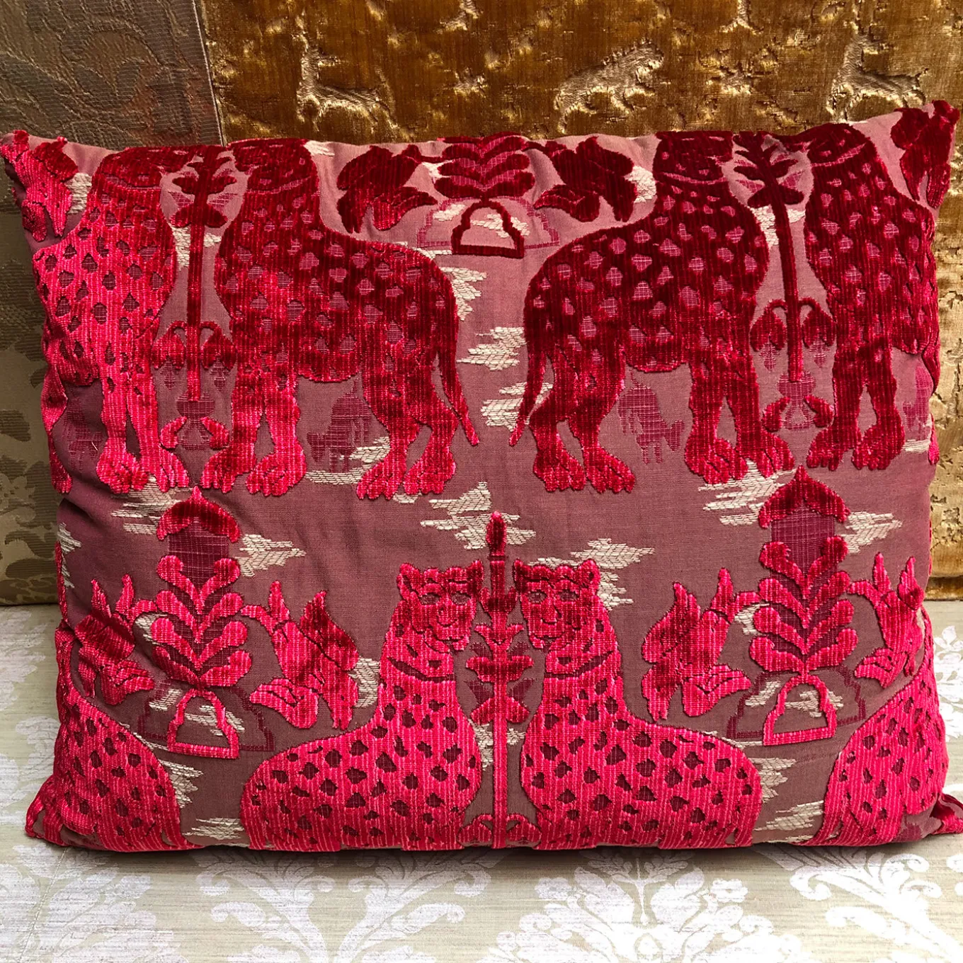 Un elegante velluto in cui il motivo principale sono gli animali che difendono la sacralità dell’albero della vita, simbolo di vita eterna. Si tratta di una riproduzione di un disegno del XIII secolo. Realizzato magistralmente con colori vivaci, questo pezzo crea un impatto visivo notevole in un salotto moderno o in una camera da letto tradizionale. Il pezzo è rifinito con chiusura a cerniera.