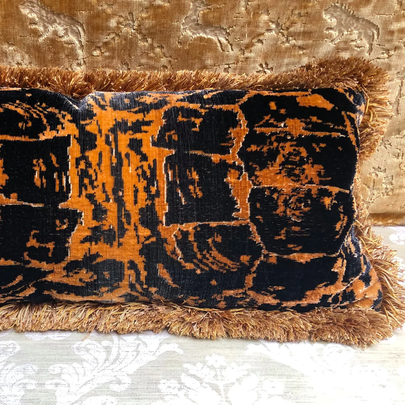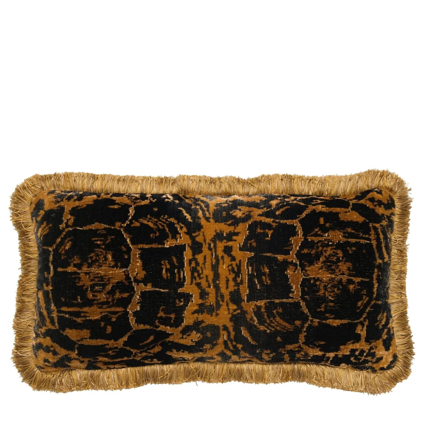 La fodera di questo cuscino fa parte della Collezione Handmade ed è magistralmente creata su telai del XVIII secolo. Il pezzo vanta un motivo geometrico che ricorda un guscio di tartaruga in audaci colori neri e oro, rifinito con una morbida frangia di marabù intorno ai bordi e una chiusura a cerniera. Il cuscino aggiungerà un accento sorprendente a una casa moderna.