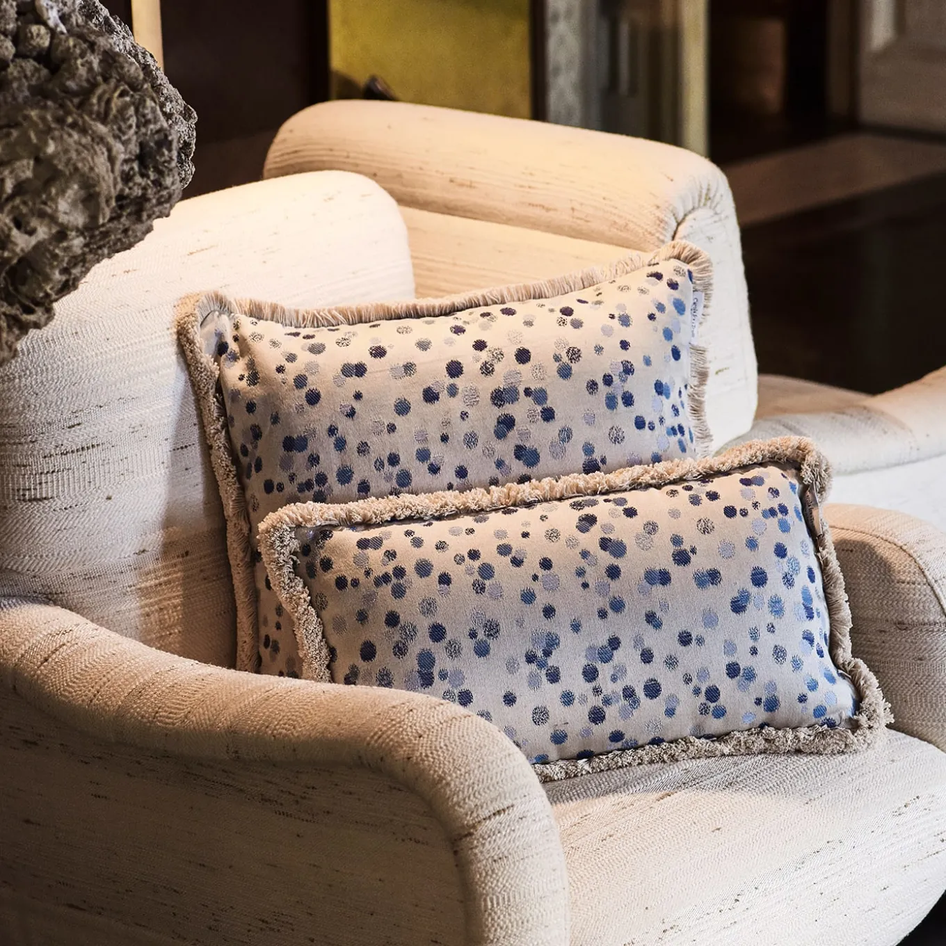 Piccolo cuscino decorativo di lusso in azzurro e marrone 30×50 cm in tessuto jacquard 100% cotone con bordo sfrangiato. Il suo esclusivo motivo tessile ricorda la tradizionale tecnica del macchiato pugliese, emblematica del marchio come celebrazione della gioiosa spontaneità della natura. Questo raffinato cuscino è realizzato interamente a mano in Italia e tessuto sugli antichi telai di una storica tessitura pugliese nel rispetto della storia, della natura e delle persone.