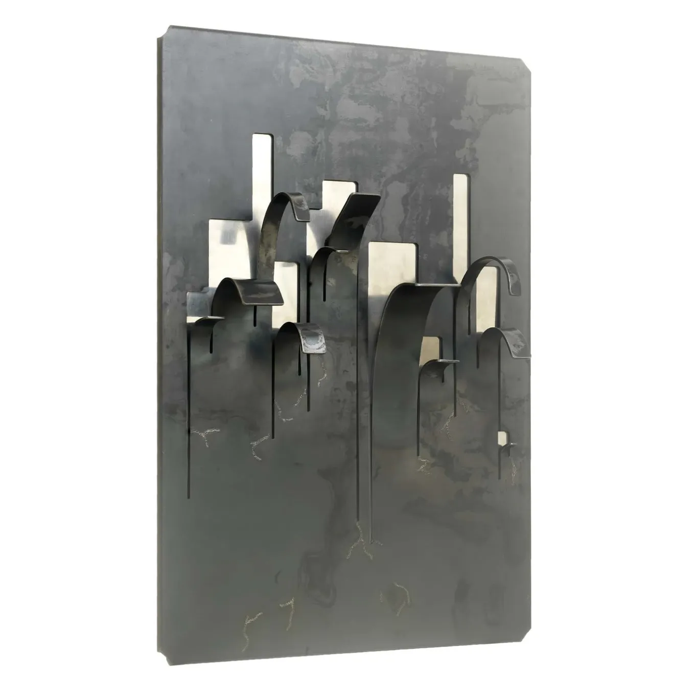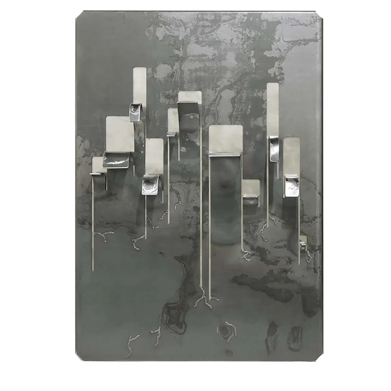 Quando la pelle esterna si apre, appare l’anima interna, metafora di una ferita che non può essere rimarginata. Il ferro è un materiale vivo, si protegge dagli agenti atmosferici ossidandosi e assumendo toni scuri e disomogenei (policromia). Un appendiabiti di colore marrone e argento realizzato in ferro e acciaio.