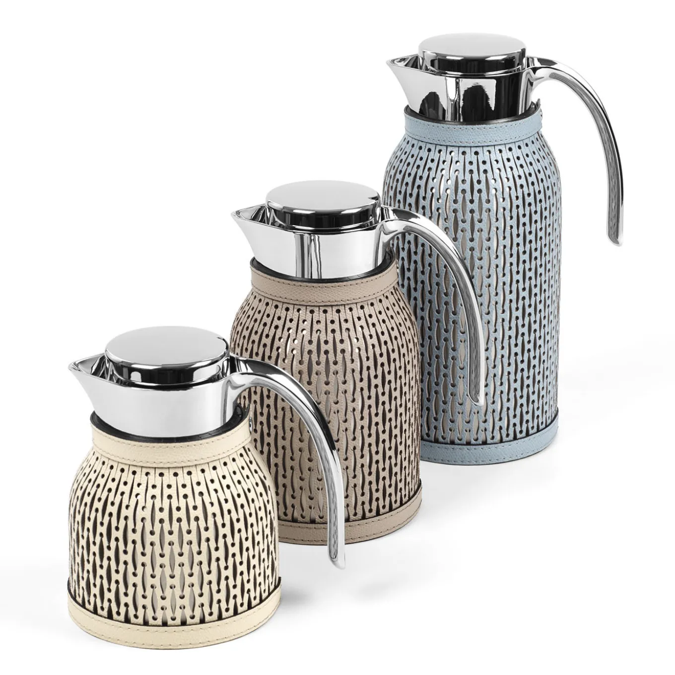 Sintesi di fascino sartoriale e funzionalità, questa caraffa termica della Collezione Diana abbina un corpo in acciaio lucido a un lussuoso manicotto in pelle (rimovibile), mostrando un sorprendente motivo traforato e un’elegante tonalità beige. Questo pezzo sarà un superbo accessorio da sfoggiare durante le riunioni di famiglia, poiché contiene fino a 600 ml e può mantenere i liquidi caldi fino a 6 ore o freddi fino a 24 ore.