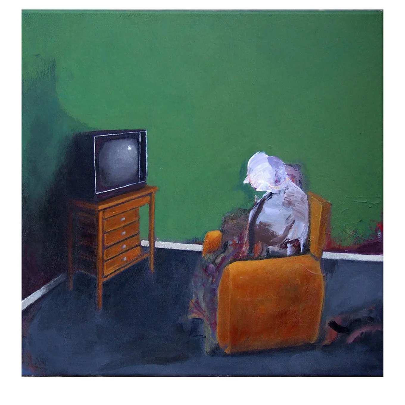 Il baratro delle stanze ritrae una figura solitaria seduta su una poltrona arancione, immersa in una stanza spoglia dalle pareti verde opaco. Il volto, cancellato da pennellate astratte in bianco e viola, perde ogni identità, trasformandosi in simbolo di anonimato o alienazione. Il pavimento scuro inghiotte la luce, amplificando la sensazione di freddezza e rigidità geometrica dello spazio. Una televisione vintage, appena accesa, poggia su un mobile in legno e suggerisce un senso di silenzio o disconnessione. Attraverso contrasti cromatici decisi e un linguaggio visivo essenziale, l’opera costruisce un’atmosfera sospesa, intima e contemplativa.