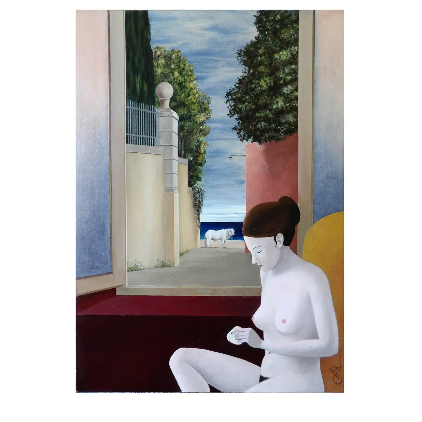 Il dipinto ‘Presso la finestra’ ritrae una scena serena in cui una donna nuda è seduta accanto a una finestra aperta, con lo sguardo verso un lontano paesaggio costiero. La composizione equilibra l’intimità dell’ambiente interno con l’ampiezza della vista esterna, caratterizzata da toni tenui e pennellate delicate. Realizzata a olio su tela e di dimensioni medie, quest’opera incarna una quiete contemplativa e una profondità narrativa sottile.