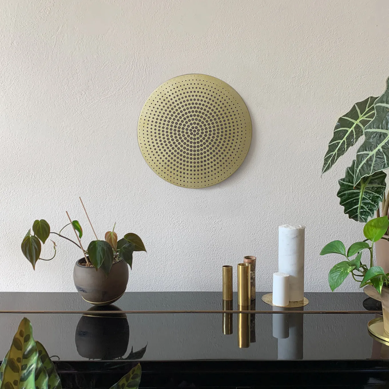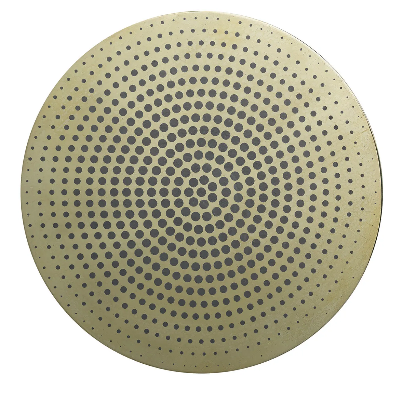 Questo elegante disco in ottone sfoggia una decorazione di puntini di diametro decrescente che si avvicinano al bordo come se fossero mossi da forze cinetiche. Ispirato alla filosofia dell’aniconismo, contraria alla rappresentazione di creature viventi o soprannaturali, è decorato con ossidi che rivelano dettagli e tonalità singolari. Il retro è firmato dall’artista per attestare l’autenticità del pezzo. Pronto per il montaggio a parete.