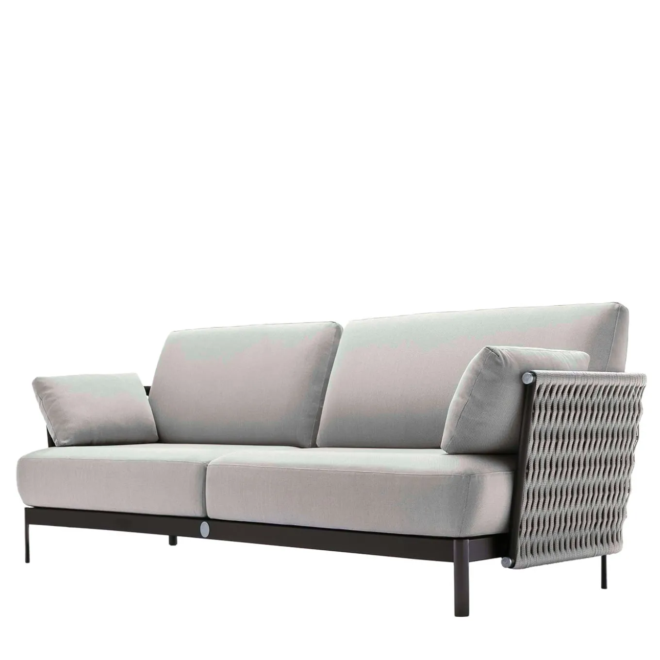 Questo divano a 3 posti è disponibile in tessuto speciale trattato o in pelle di prima scelta. Imbottitura dei cuscini in dacron impermeabile. Struttura in combinazione di metallo nero satinato trattato in cataforesi con logo Giorgio Collection inserito e corde intrecciate grigio chiaro. Speciale copertura per esterni inclusa nel prezzo. Design di Castello Lagravinese Studio