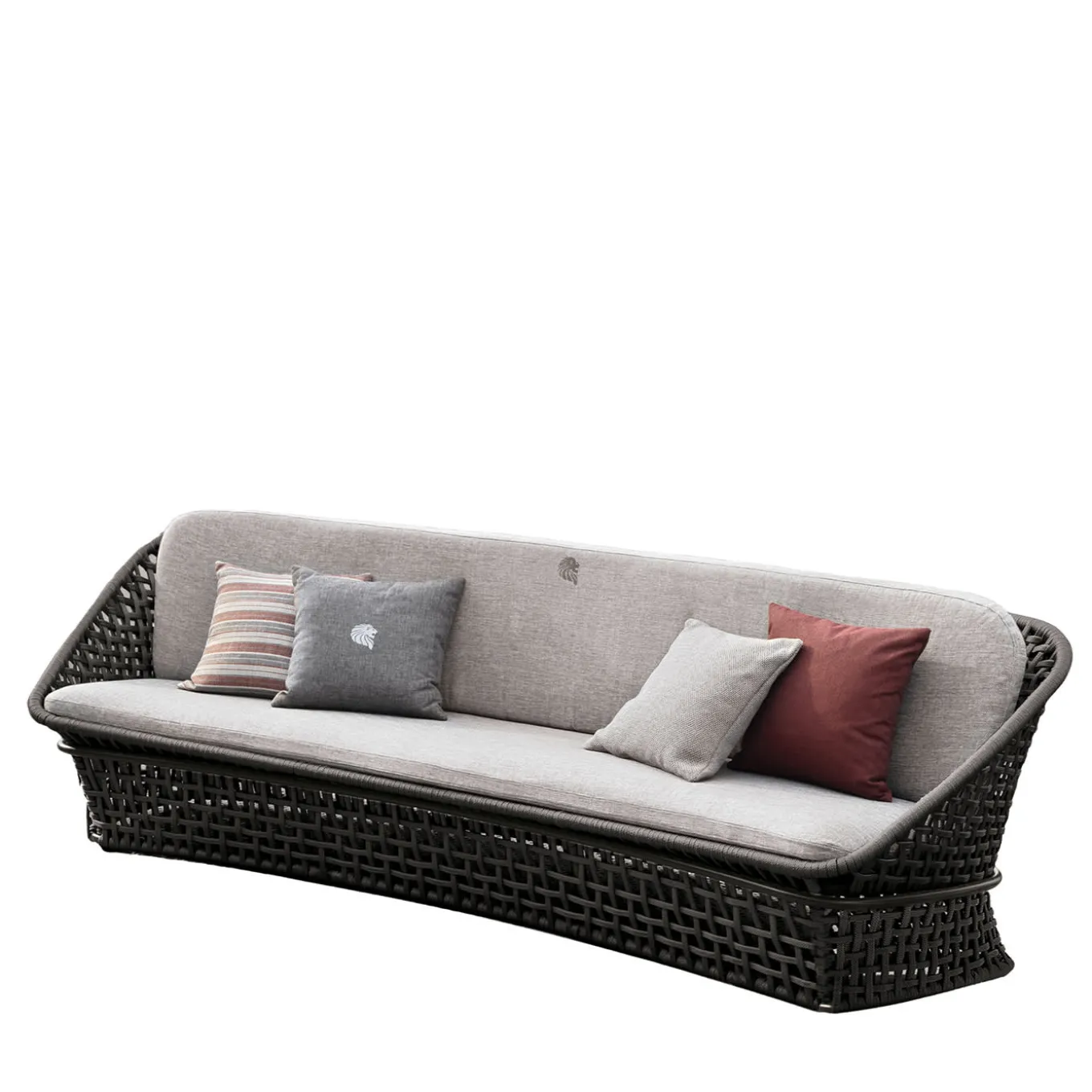 Divano a 4 posti disponibile in tessuto appositamente trattato. Imbottitura dei cuscini in dacron impermeabile. La struttura è costituita da una combinazione di metallo nero satinato trattato in cataforesi con l’inserimento del logo Giorgio Collection e di cordame nero intrecciato. Speciale copertura per esterni inclusa nel prezzo.