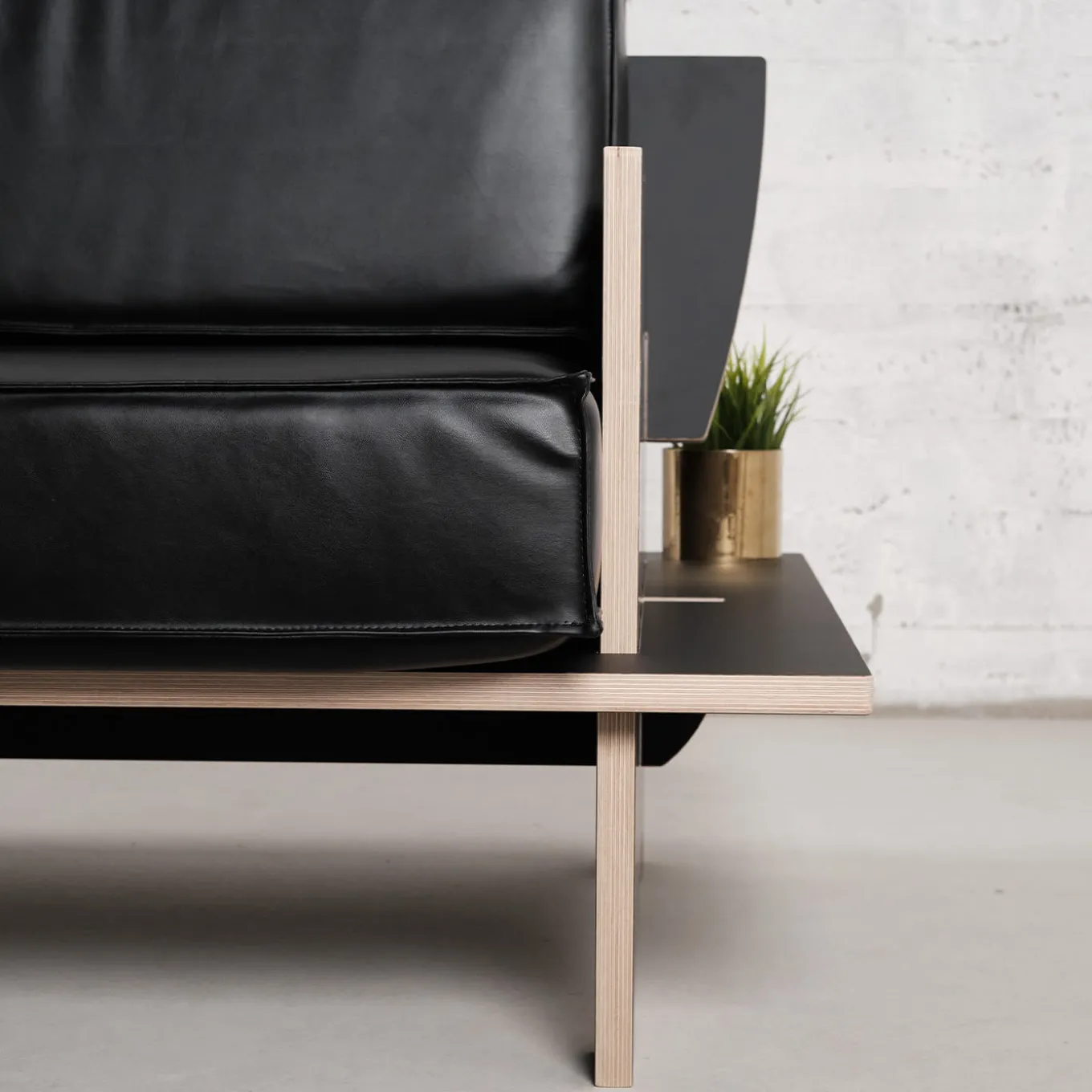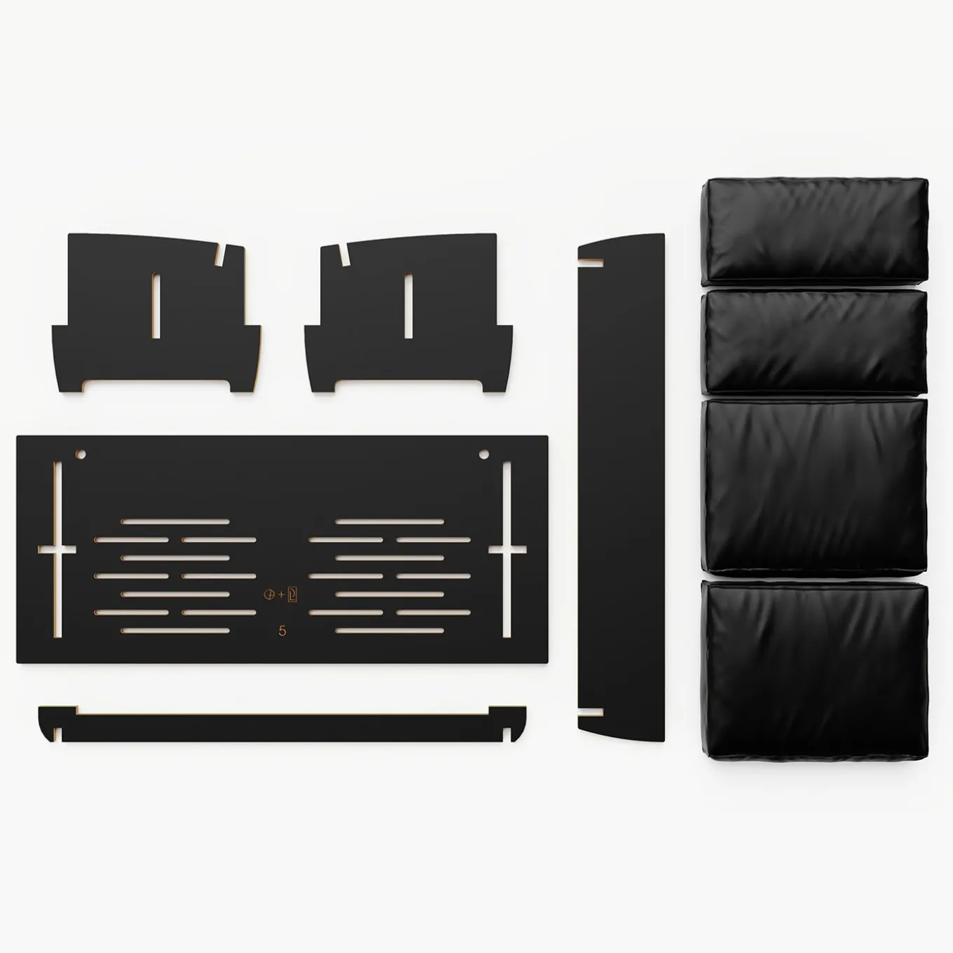 Combinando minimalismo e un’inaspettata qualità multi-tasking, questo divano è ottenuto semplicemente incastrando cinque (“cinque” in italiano) tavole di multistrato di betulla. Il loro assemblaggio delinea un pratico ripiano avvolgente per la raccolta dei libri, mentre i cuscini rivestiti in ecopelle nera (o in tessuto su richiesta) possono essere rimossi per fungere da letto per i bambini. Gli inserti in Fenix® soft-touch completano l’opera. Per ogni acquisto viene piantato un pino dei Caraibi con l’aiuto di ZeroCo2.