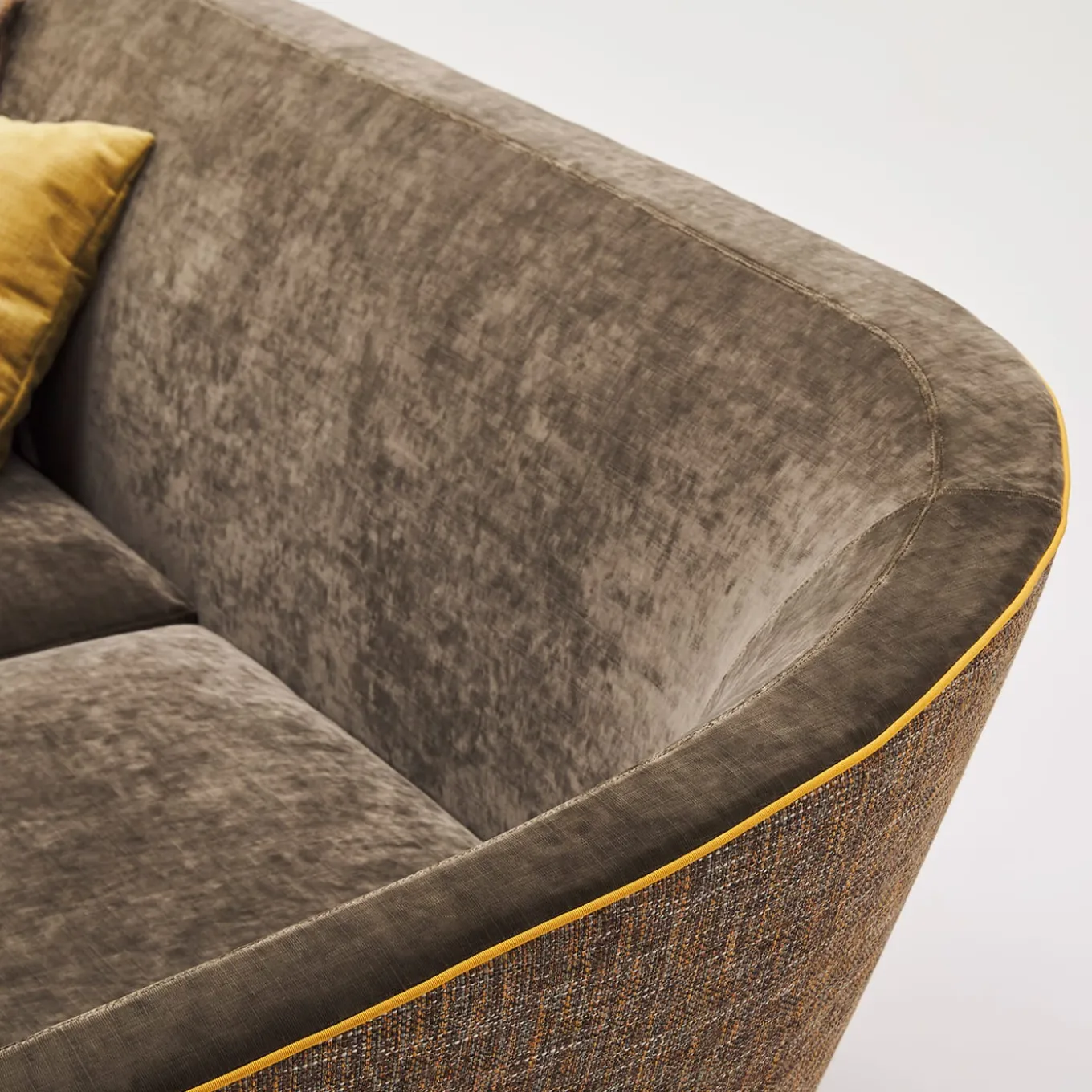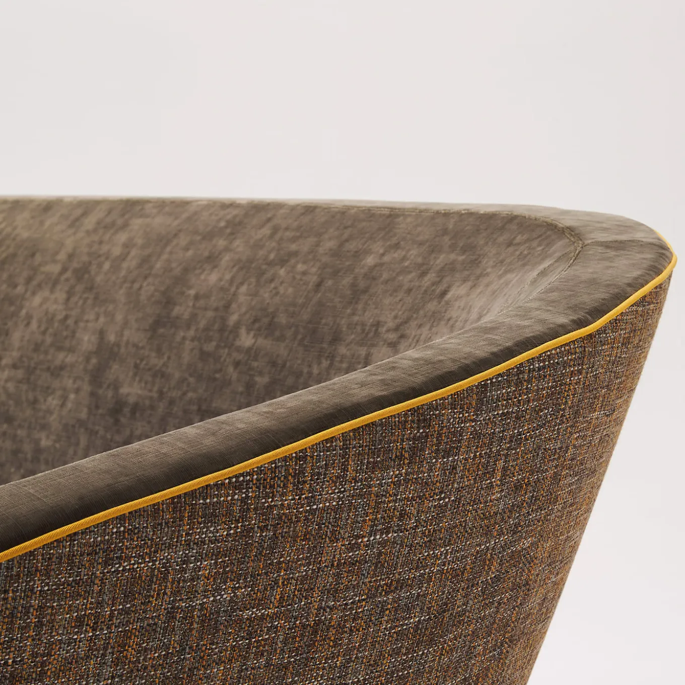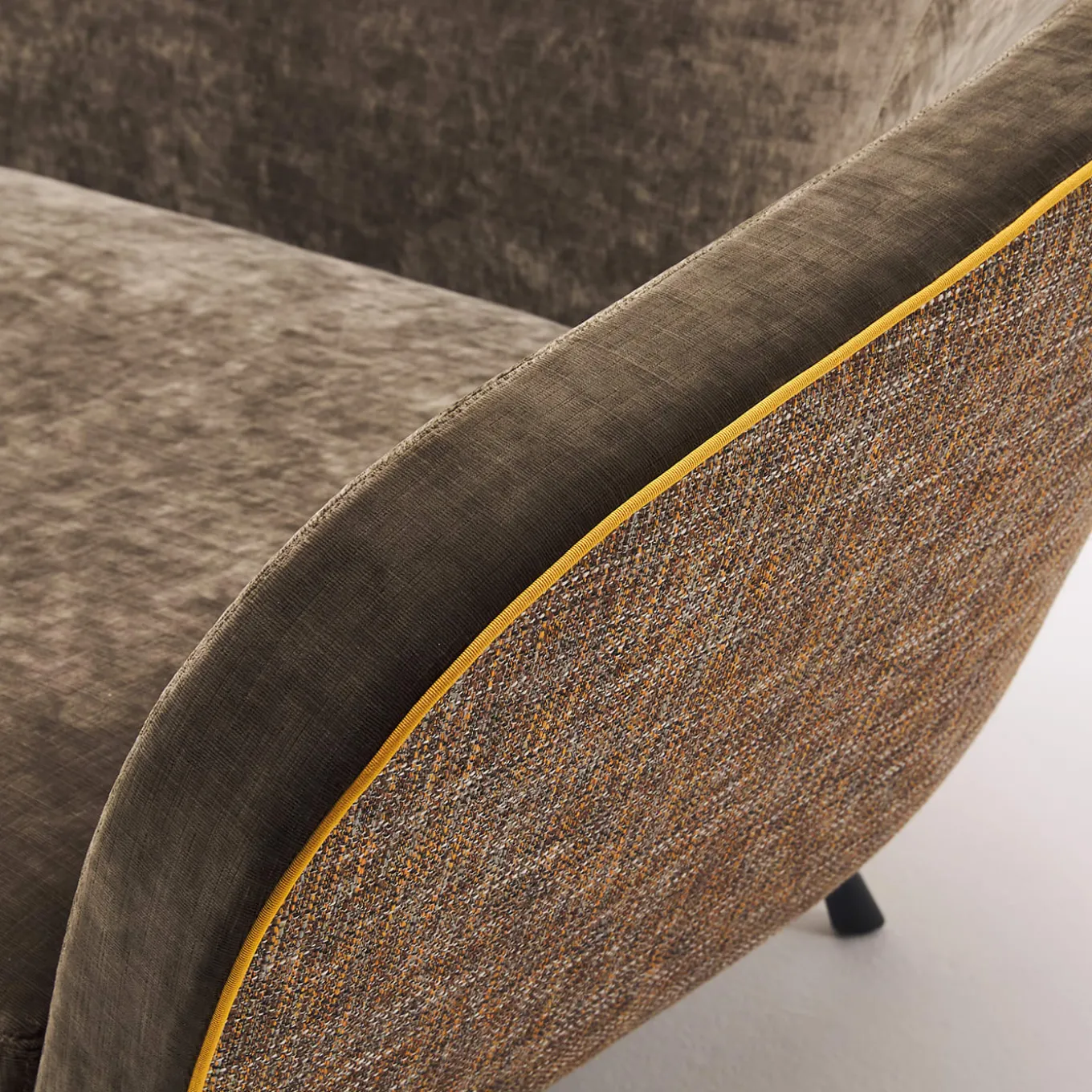 L’indulgenza per le curve fluide tipica dei design degli anni ’50 ha ispirato il design armonioso di questo divano. Sfidante nella sua idea di reinventare forme disegnate spontaneamente dalla natura, è caratterizzato da una scocca avvolgente che degrada dolcemente sui lati, il cui profilo è esaltato da un vivace bordino giallo. La generosa imbottitura in poliuretano espanso a densità differenziata testimonia il potenziale di comfort del progetto, perfezionato dal morbido rivestimento in tessuto di colore marrone. I cuscini non sono inclusi.