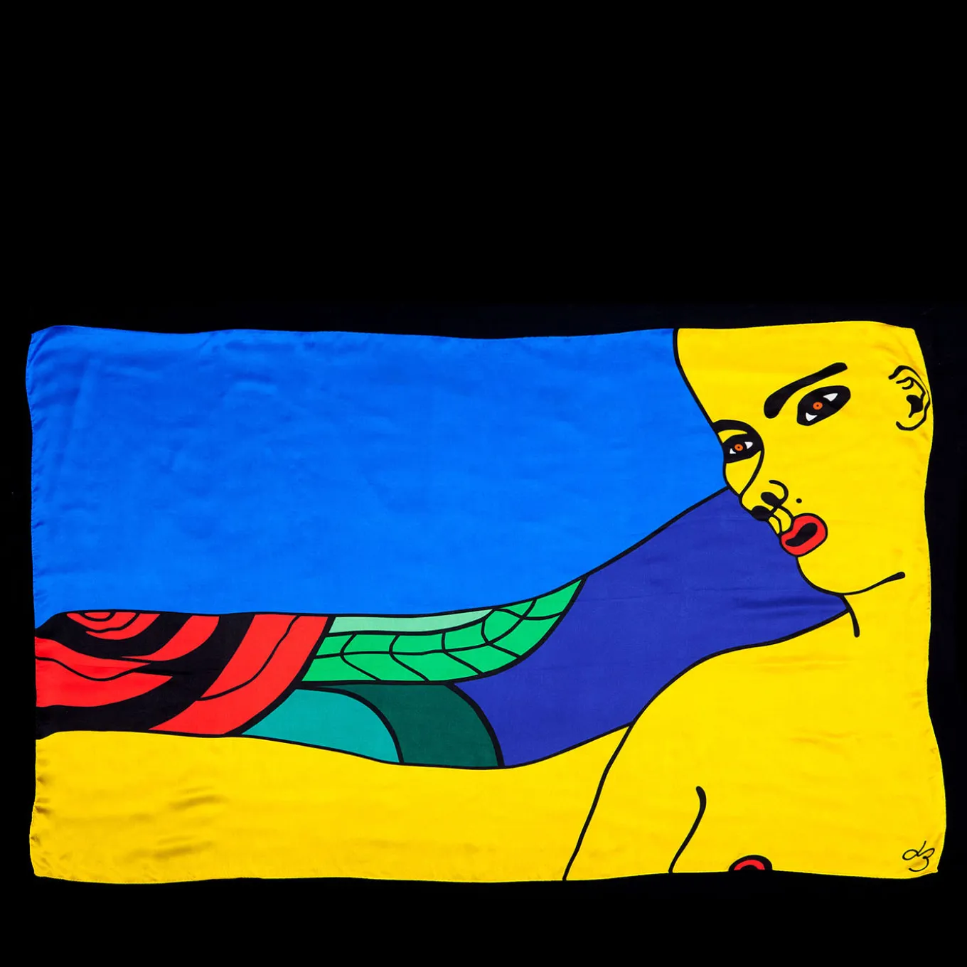 Questa meravigliosa stampa su foulard di seta fa parte della capsule collection realizzata dallo stilista Elio Fiorucci con il marchio Art Therapy, con l’obiettivo di offrire ai clienti autentiche opere d’arte da indossare. Una donna asiatica nuda che guarda in disparte è al lato della stampa, la sua silhouette si staglia su un motivo di toni vibranti e contrastanti.
