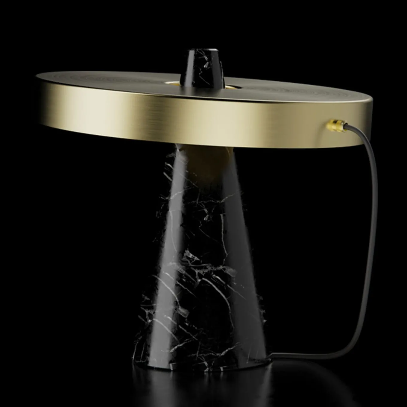Perfetta combinazione di arte e design, questa lampada da tavolo presenta un superbo gioco di linee, tonalità e materiali raffinati. Questa composizione scultorea è caratterizzata da una base conica in pietra di marmo nero e da uno spesso anello di metallo rifinito in ottone che sembra essere in equilibrio sulla sommità del cono.